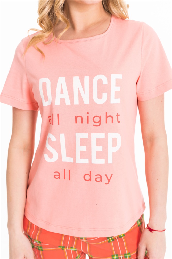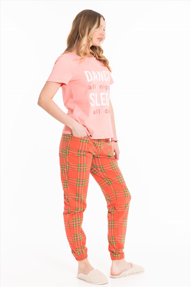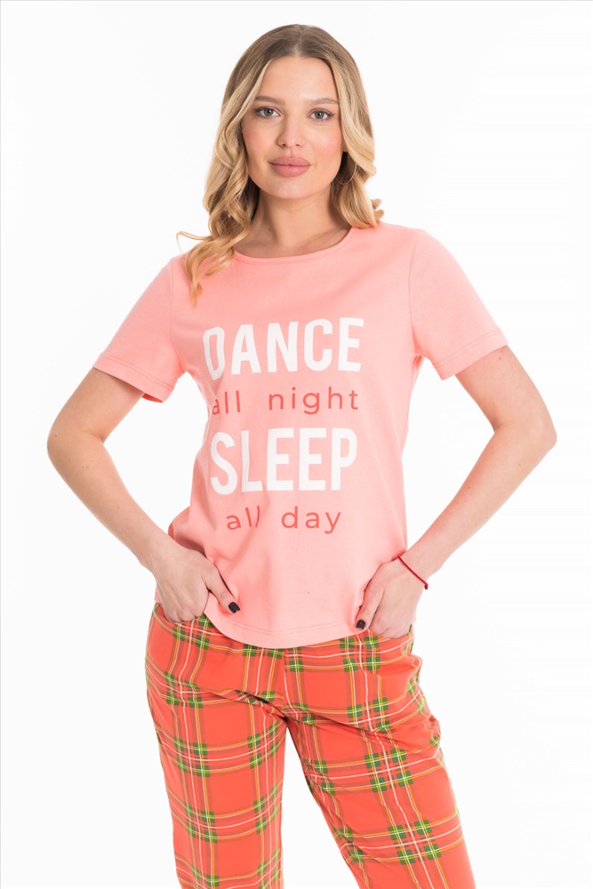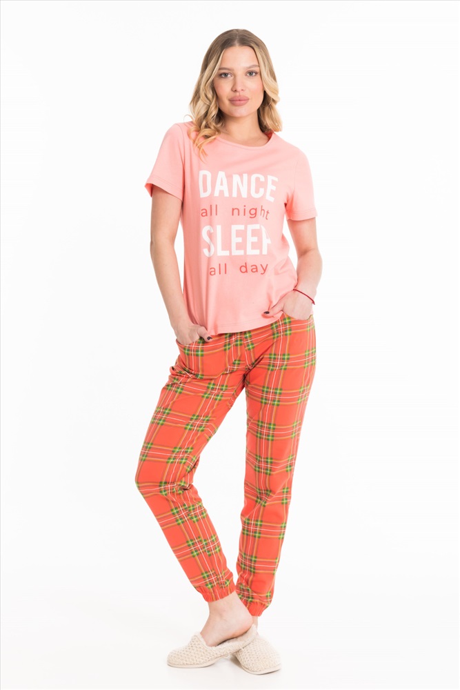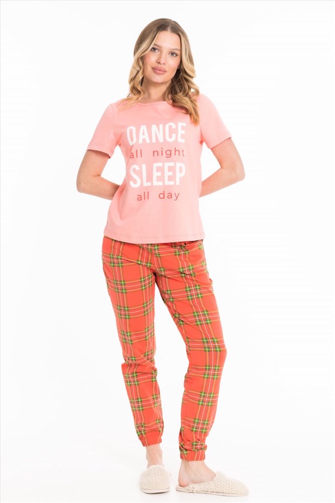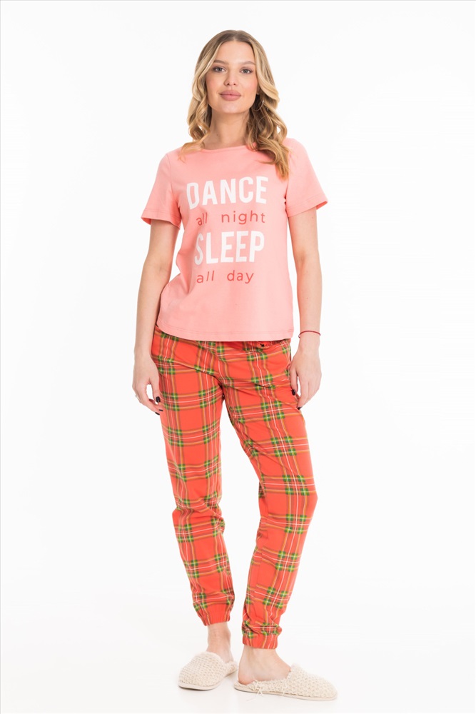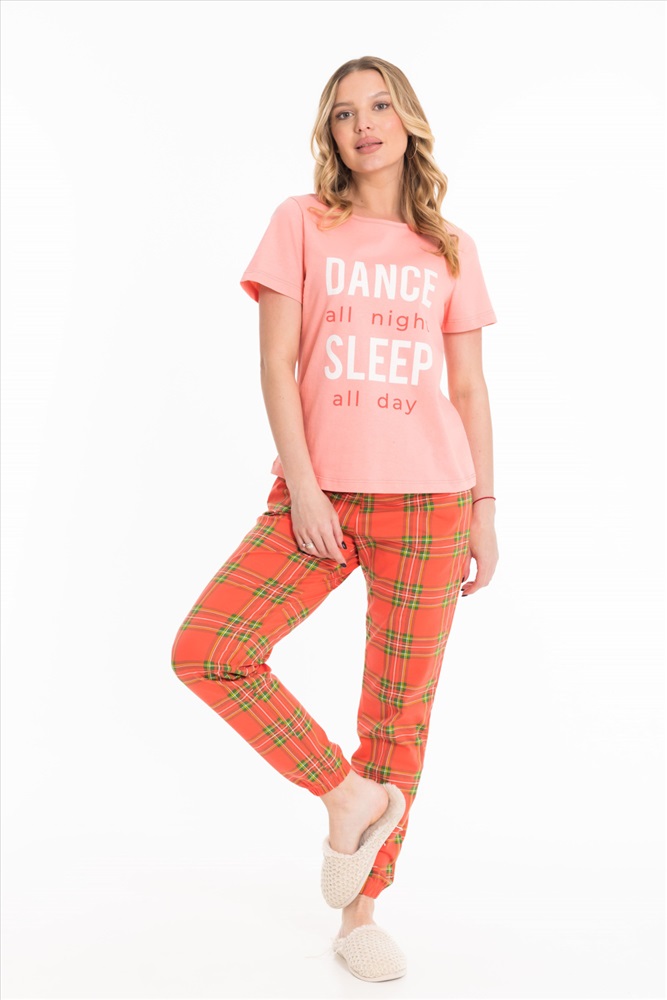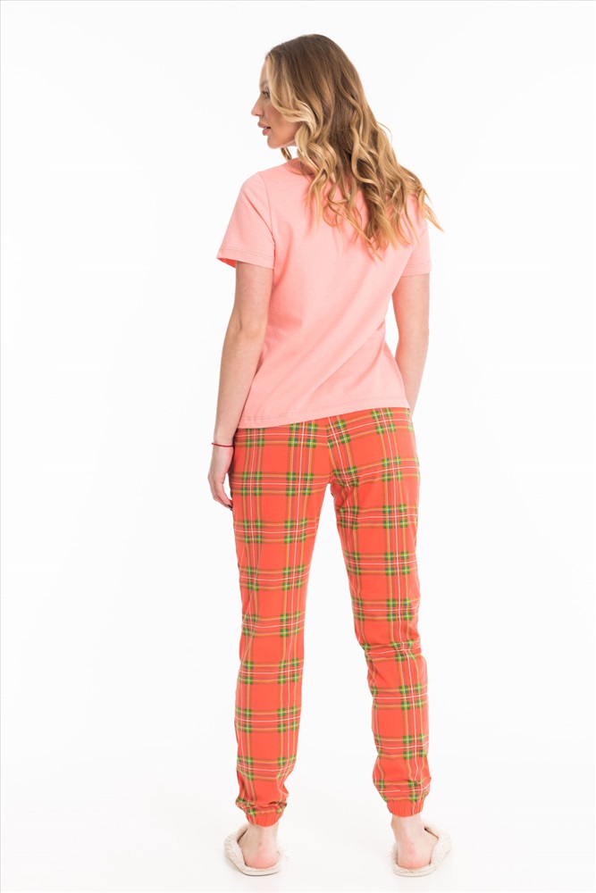 Женская пижама — отличный выбор для комфортного сна или отдыха. Она изготовлена из мягкого и приятного к телу хлопкового полотна. Футболка с втачным рукавом и круглым вырезом горловины. Спереди расположен принт, который добавляет яркости и оригинальности. Брюки с боковыми карманами и поясом на резинке. Такая пижама идеально подойдёт для домашнего отдыха.
