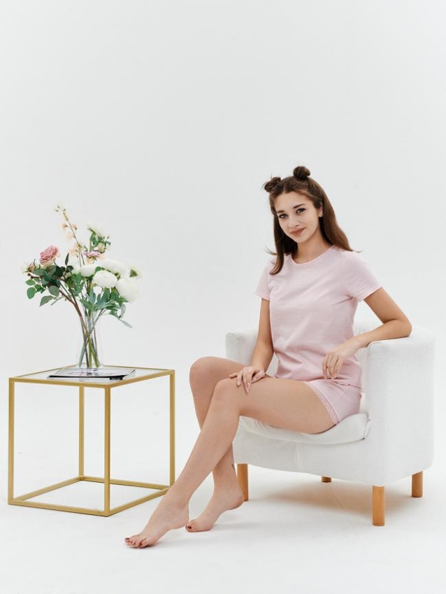 Комплект пижамы состоит из футболки и шорт. Футболка с коротким втачным рукавом. Горловина обработана планкой и имеет элегантную отстрочку. Изящные шортики украшены мягким кружевом стрейч. Стильная и удобная пижама позволит чувствовать себя привлекательной, создаст хорошее настроение и комфортную атмосферу для сна.
