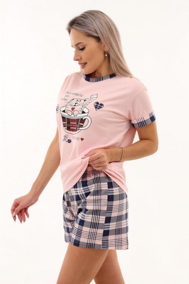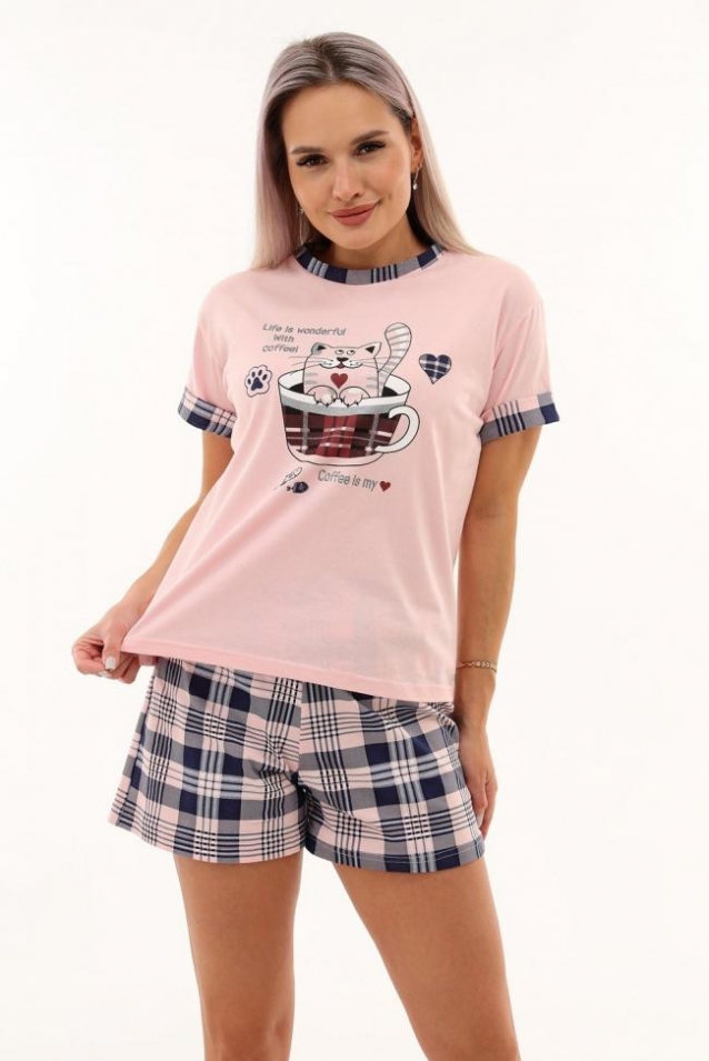 Уютная пижама с оригинальным принтом из очень мягкой, приятной к телу ткани. Футболка со спущенной линией плеча. Шорты свободного кроя. Может использоваться как домашний костюм.