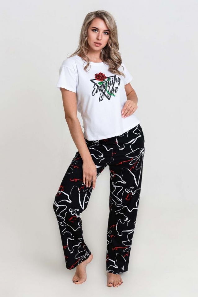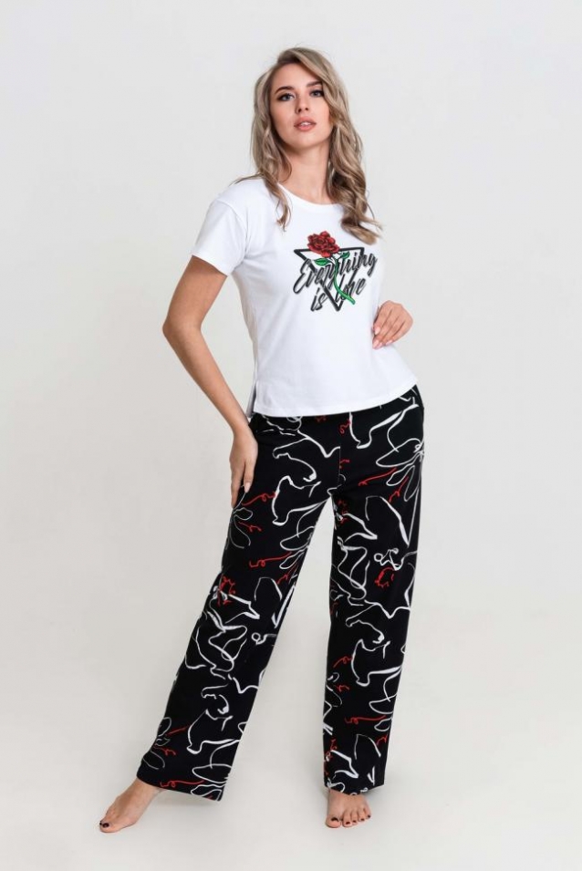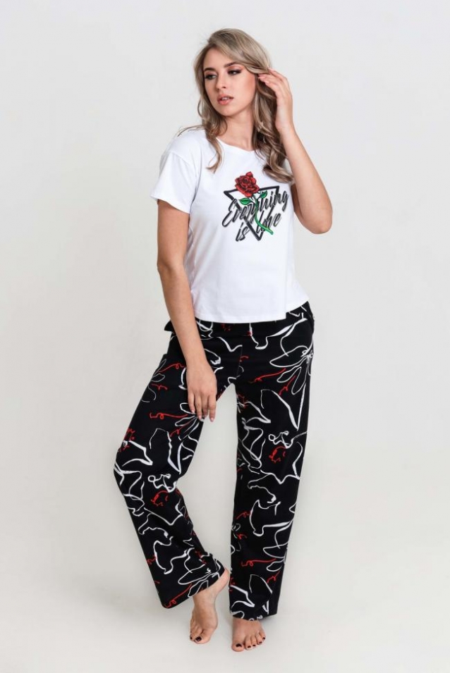 Пижама женская из хлопка от Российского производителя. Футболка 95% хлопок,5% лайкра. Брюки 100% хлопок. Пижама домашняя для сна. Белая футболка укороченная с принтом роза и надписью. Брюки с карманами, пояс на резинке со шнурком. Футболка с брюками подойдут как для повседневного ношения, домашнего времяпрепровождения и комфортного сна. Приятная к телу вещь порадует Вас уютом и комфортом. Отличный подарок сестре, дочери, маме, жене, подруге.