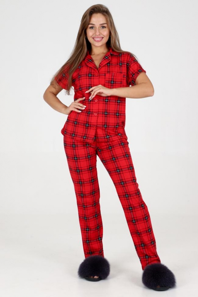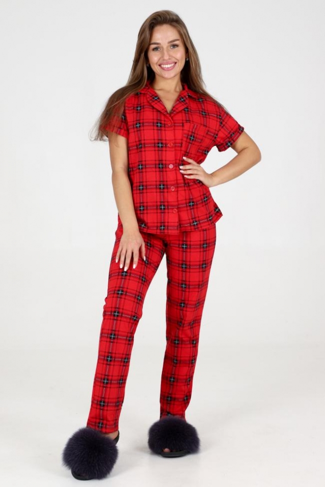 Классная удобная пижама на каждый день с кофточкой на пуговицах, отложной воротник, короткий рукав на манжете, брюки прямого кроя .