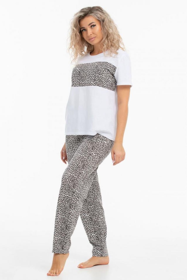 Женская пижама состоит из футболки и брюк. Футболка изготовлена из трикотажного полотна пике, имеет свободный крой и достигает середины бедер. Рукав втачной, короткий. Брюки имеют длину 7/8, свободно сидят в бедрах и сужаются к низу. Модель оснащена боковыми внутренними карманами с округлым входом, а пояс выполнен на резинке.