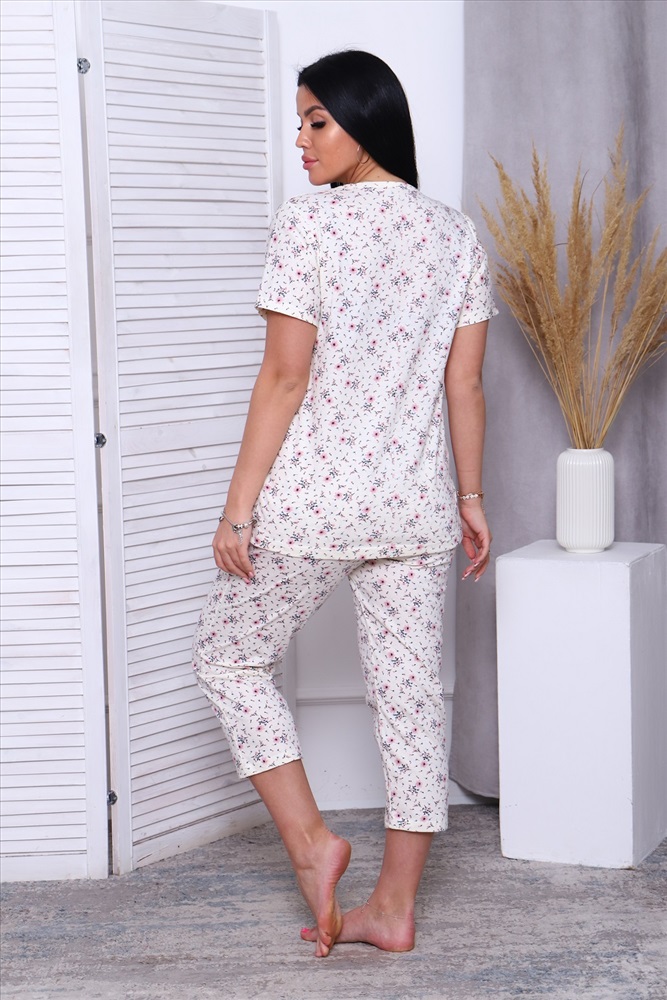 Состав: Хлопок 100% Модель: Пижама 57074 Тип товара: пижама с бриджами Материал: кулирка | кулирка Бренд: Натали Суслова Назначение: для дома Отделка: с печатью Рейтинг: Рейтинг 4 и выше Рисунок: крупный принт | разное | цветы Рукав: короткий рукав Сезонность: лето | осень | весна | зима Силуэт: полуприлегающий Стиль: домашний Пижама женская Весенняя: бриджи и базовая футболка, нежный очаровательный цветочный принт и крупный принт на полочке футболки создают романтичное настроение. Комфортно носить и спать - 100% хлопок. Таблица размеров и весафутболка