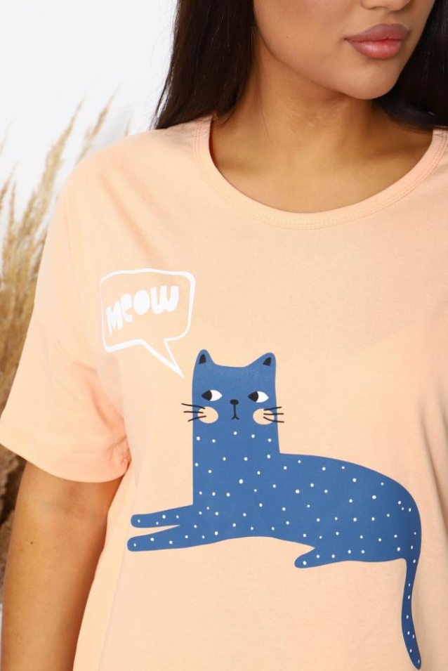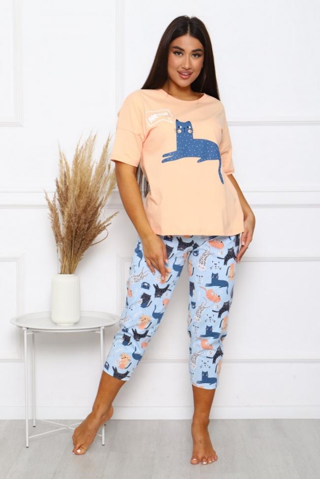 Пижама женская Коты, с брюками, в боках карманы, футболка с коротким рукавом, свободного кроя, с милым принтом на полочке.