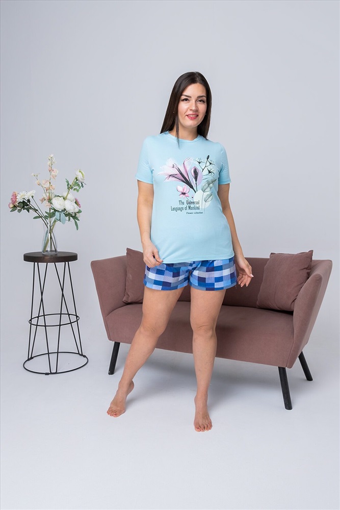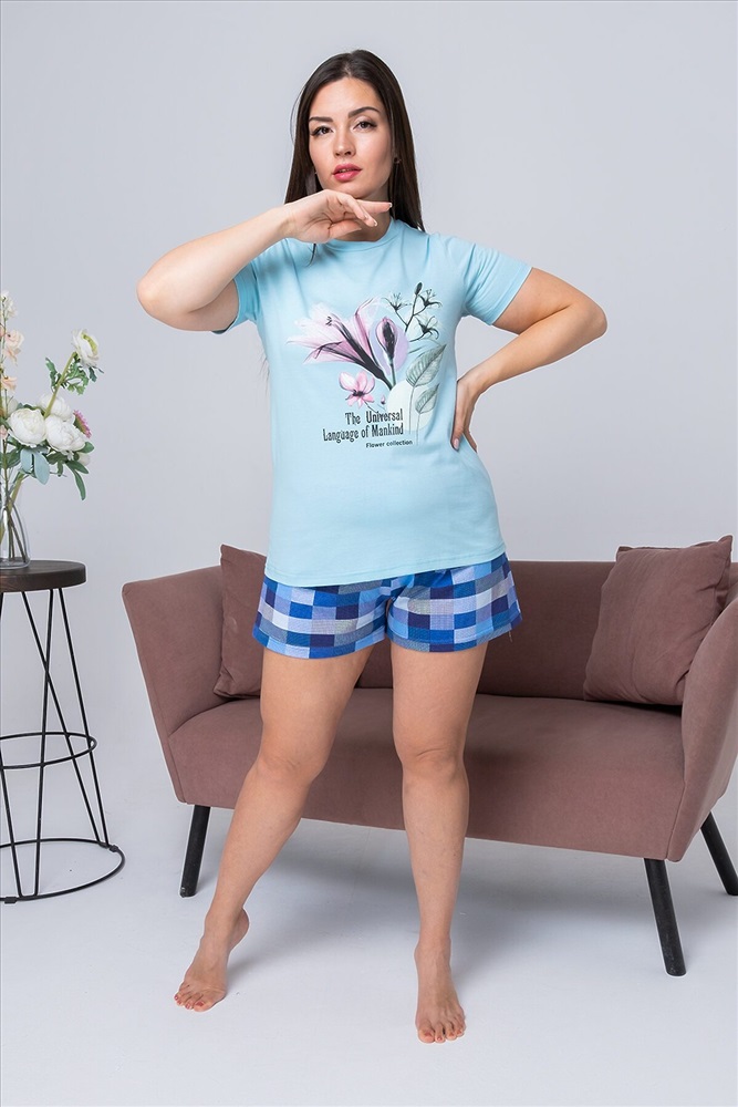 ID товара: 810733 Состав: 100% хлопок Сезон: Весна/Лето Длина: Средняя Фасон: Прямой Рукав: Короткий Вид застежки: Без застежки Декоративные элементы: Принт Основная ткань: Хлопок | Кулирка Стиль: Повседневный Страна бренда: Россия Страна производства: Россия Пижама женская состоит из футболки с коротким рукавом и шортов. Футболка из однотонной кулирки с красивым принтом, шорты свободного покроя из ткани кулирка набивка в клеточку. Пижама для сна и дома. После стирки не меняет цвет и форму. Комментарии к товару
