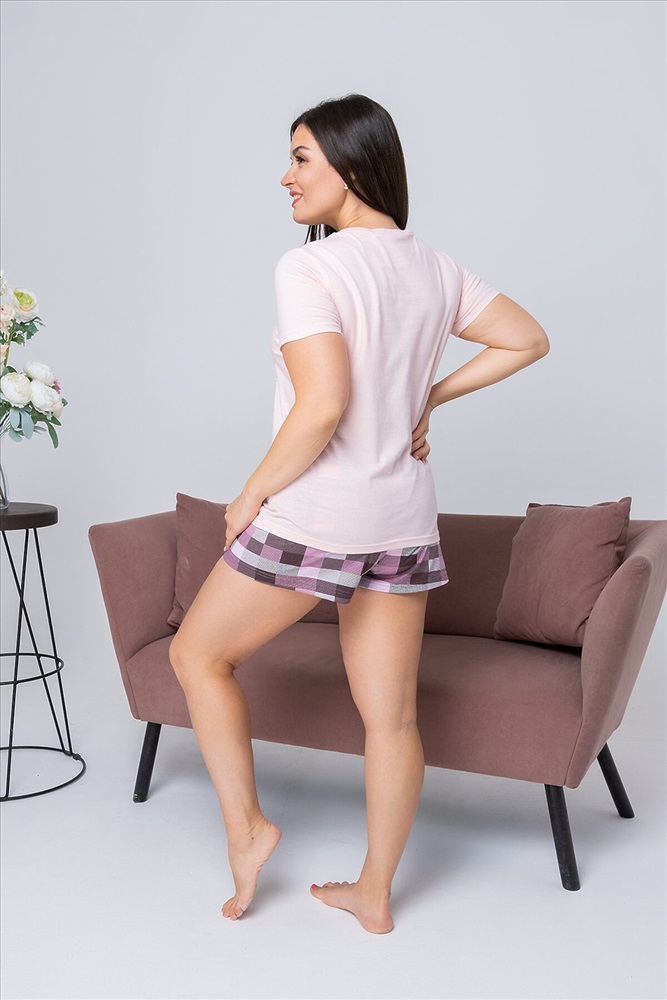 ID товара: 810735 Состав: 100% хлопок Сезон: Весна/Лето Длина: Средняя Фасон: Прямой Рукав: Короткий Вид застежки: Без застежки Декоративные элементы: Принт Основная ткань: Хлопок | Кулирка Стиль: Повседневный Страна бренда: Россия Страна производства: Россия Пижама женская состоит из футболки с коротким рукавом и шортов. Футболка из однотонной кулирки с красивым принтом, шорты свободного покроя из ткани кулирка набивка в клеточку. Пижама для сна и дома. После стирки не меняет цвет и форму. Комментарии к товару
