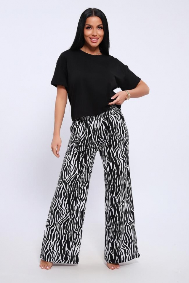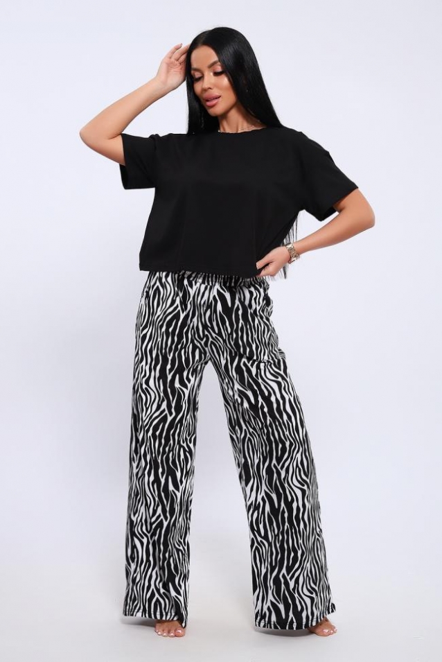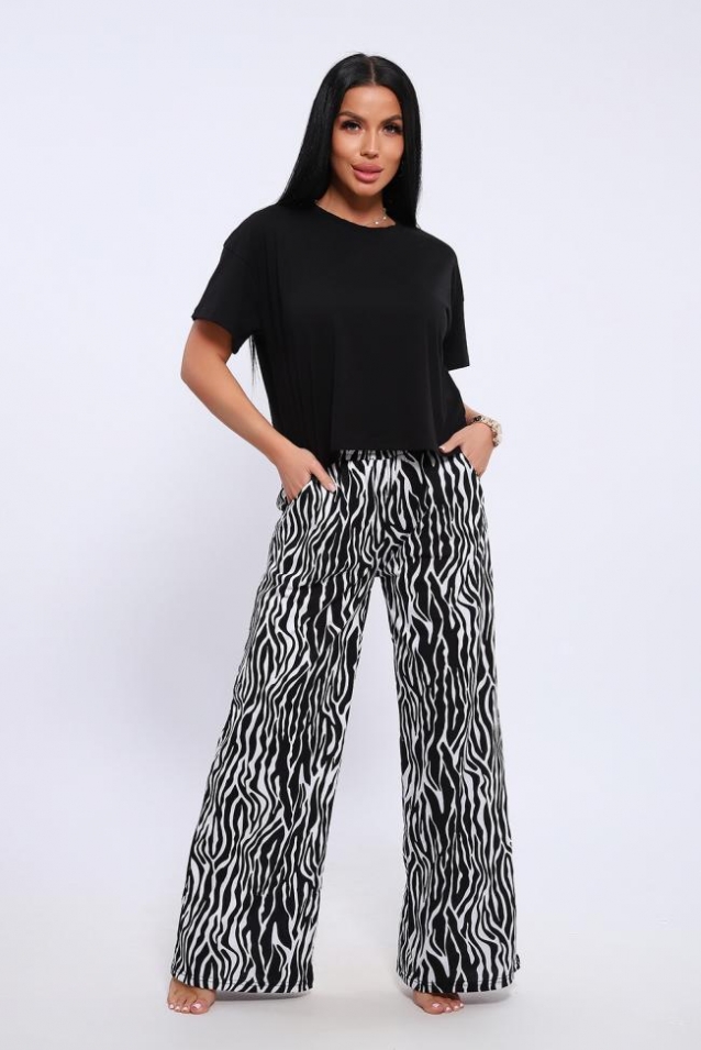 Домашняя женская пижама их мягкого хлопка. Свободная футболка прямого кроя, со смещенными плечевыми швами. Вырез горловины округлой формы с обтачкой. Длина футболки укорочена выше линии бедер, что является трендом сезона. Широкие брюки прямого кроя с высокой посадкой, с вместительными боковыми карманами, пояс на резинке с декоративной отстрочкой и атласным милым бантиком. Длина брюк стандартна, чуть ниже щиколотки. На модели представлен 48 размер. Параметры модели 165см, 97-71-101 В замерах готового изделия Объем бедер, см представлен замер Обхват низа, см.