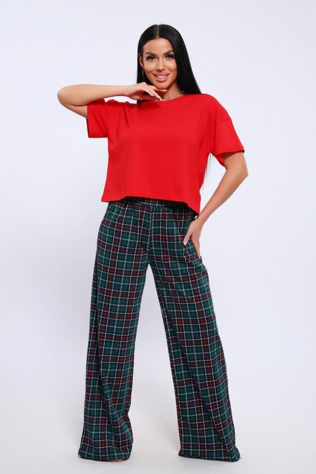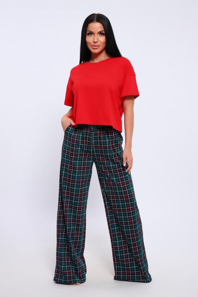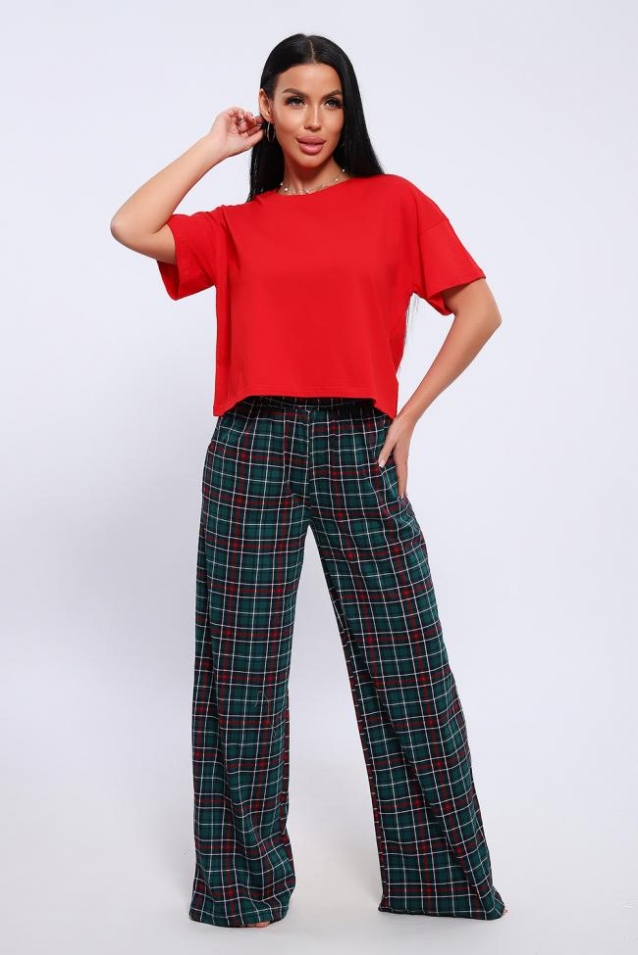 Домашняя женская пижама их мягкого хлопка. Свободная футболка прямого кроя, со смещенными плечевыми швами. Вырез горловины округлой формы с обтачкой. Длина футболки укорочена выше линии бедер, что является трендом сезона. Широкие брюки прямого кроя с высокой посадкой, с вместительными боковыми карманами, пояс на резинке с декоративной отстрочкой и атласным милым бантиком. Длина брюк стандартна, чуть ниже щиколотки. На модели представлен 48 размер. Параметры модели 165см, 97-71-101 В замерах готового изделия Объем бедер, см представлен замер Обхват низа, см.