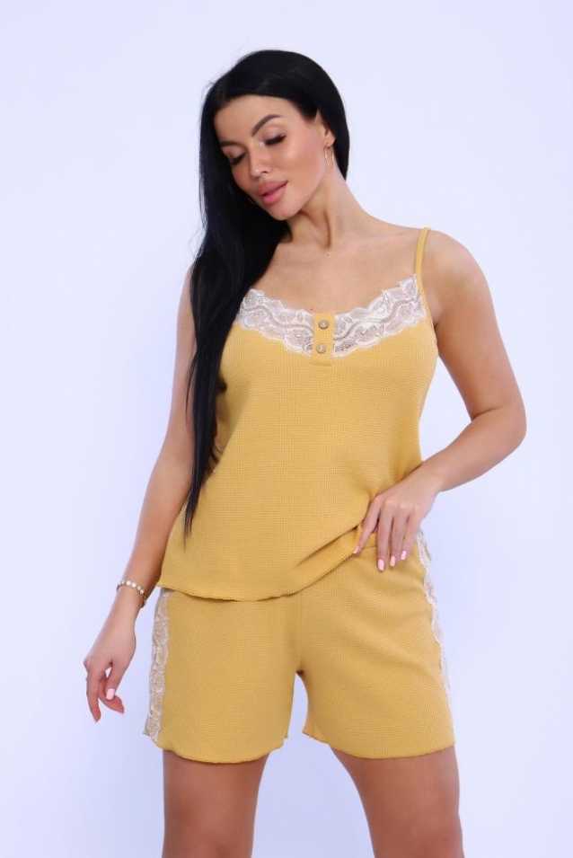 Пижама женская с эластичным кружевом-реснички выполнена из качественного, приятного к телу трикотажа СОТЫ. Комплект состоит из топа на узких бретелях и шорт. Привлекательный, комфортный топ с кокеткой на груди из эластичного кружева гармонично сочетается с шортами, украшенными по бокам кружевом. Пижама станет Вашим незаменимым элементом для отдыха и сна, вы будете чувствовать себя уютно и модно. Модель представлена в широкой палитре цветов, что позволит подобрать вещь на любой вкус и стиль, а также подчеркнет женственность и романтичность вашего образа.