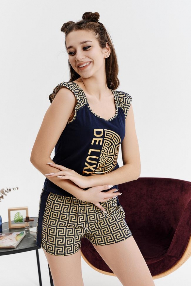 Комплект состоит из майки и шорт. Майка полуприлегающего силуэта, с округлой горловиной, на широких бретелях из отделочного полотна. Горловина, проймы обработаны бейкой из отделочного полотна. Шорты прямые, короткие, на резинке, с лампасом вдоль боковых швов.