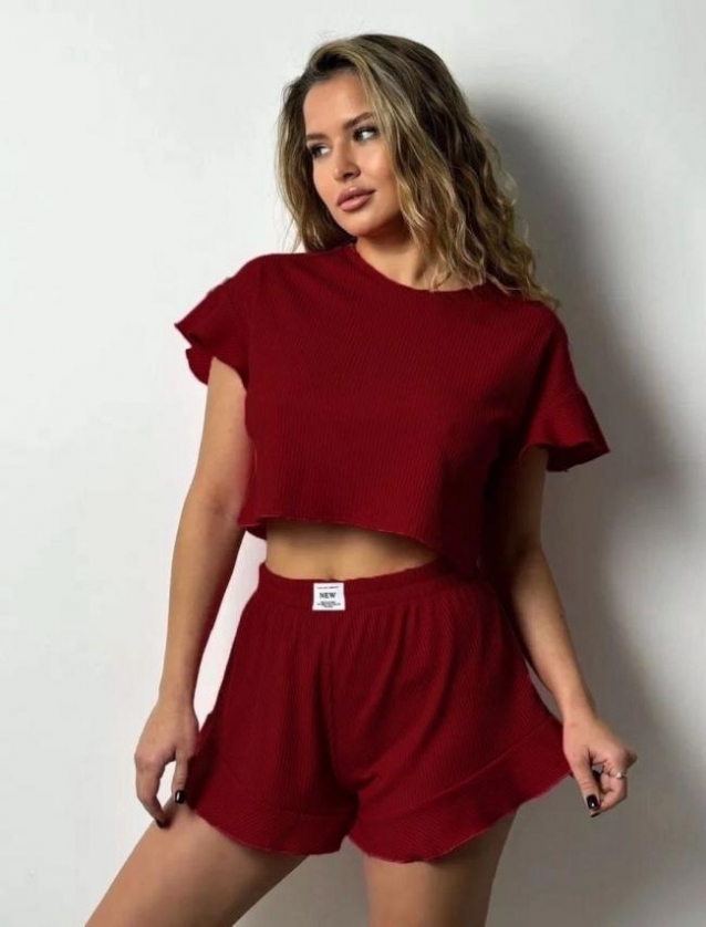 Модная пижама с шортами и топом с коротким рукавом это идеальный выбор качественной домашней одежды! Благодаря мягкой трикотажной ткани в рубчик лапша и свободному крою оверсайз комплект не будет стеснять движения, не линяет, не теряет форму после стирки и не скатывается. Одежда будет комфортной не только во время сна также подойдет для повседневной носки дома в независимости от времени года.
