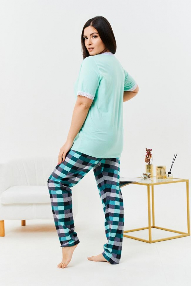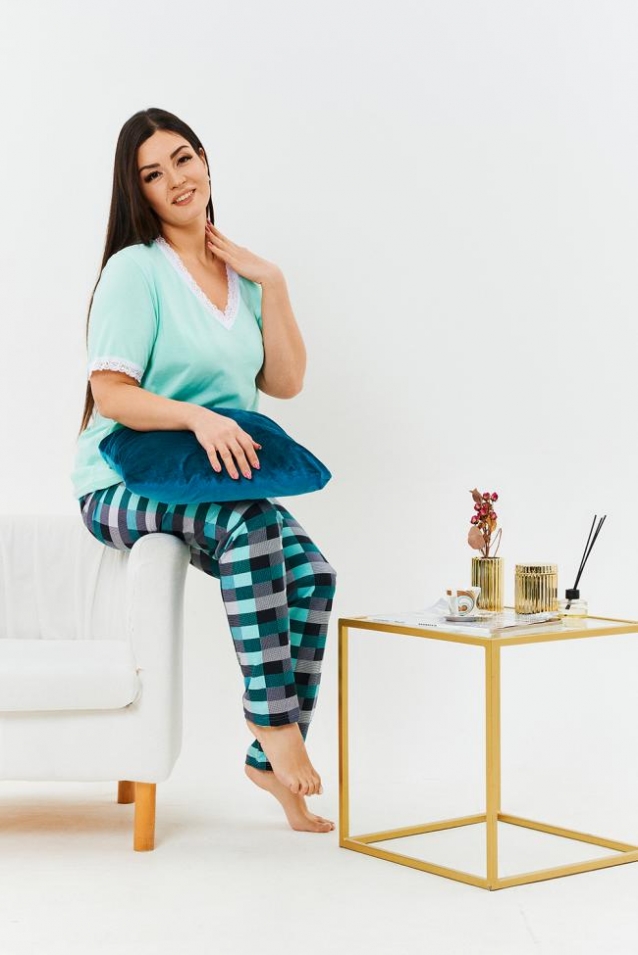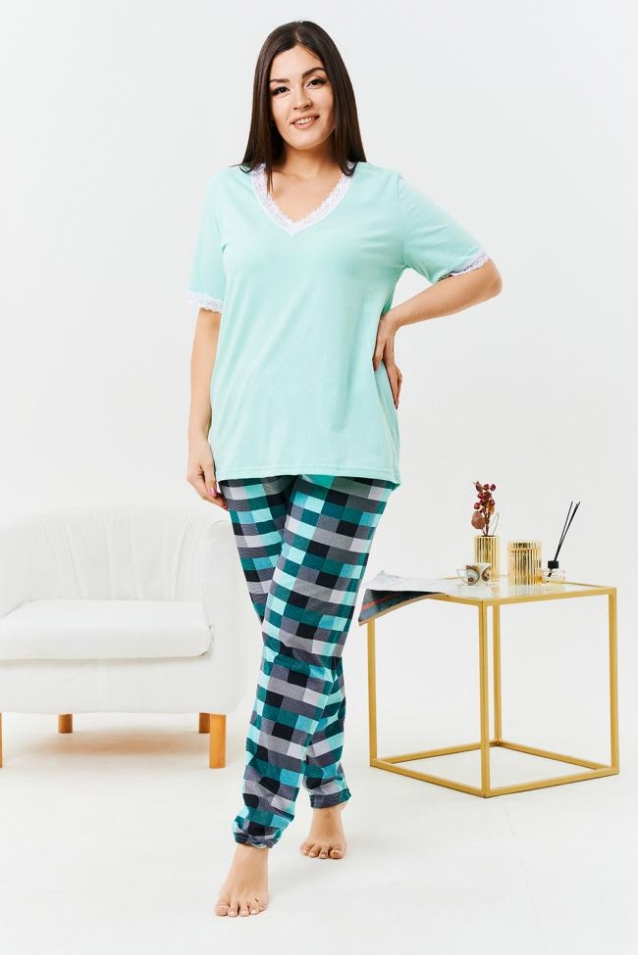 Пижама женская из кулирки 100% хлопок состоит из г/к футболки и брюк. Футболка нежного оттенка с V-образным вырезом, горловина и рукава обработаны красивым эластичным кружевом белого цвета. Брюки из набивной кулирки в клетку, могут быть с боковым швом. Пижама подходит для сна и дома, комфортная, удобная, не меняет цвет после стирки. Рост модели на фото 165см, размер 48