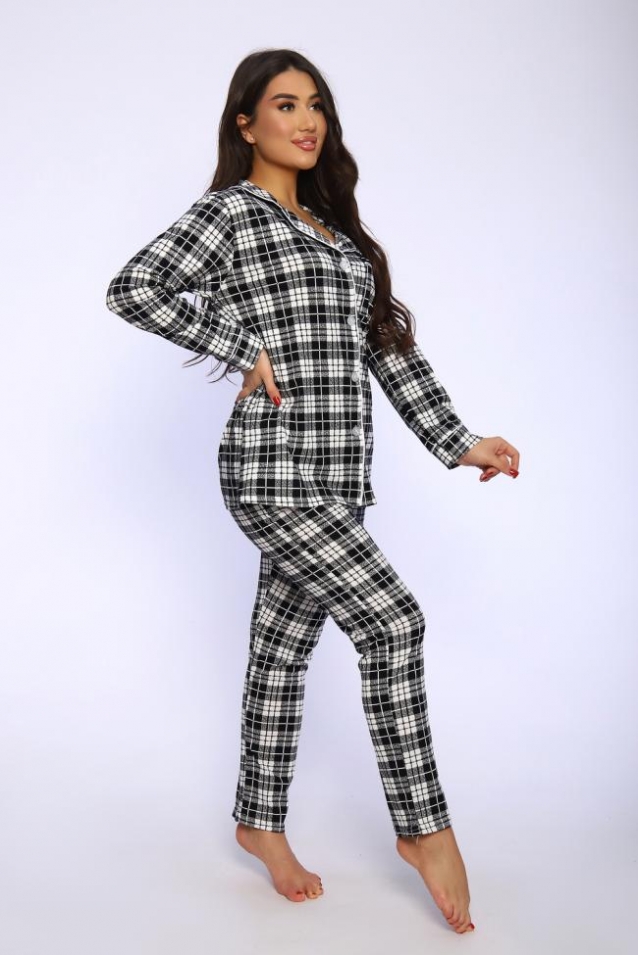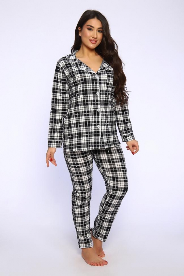 Пижама свободного кроя из мягкой хлопчатобумажной ткани в клетку. Комплект состоит из кофты и брюк. Кофта с длинным рукавом, на пуговках и с карманом на груди. Атласный кант по подборту, воротнику, карману и манжету. Брюки прямые с карманами. Эта пижама комфортна для повседневной носки и сна.