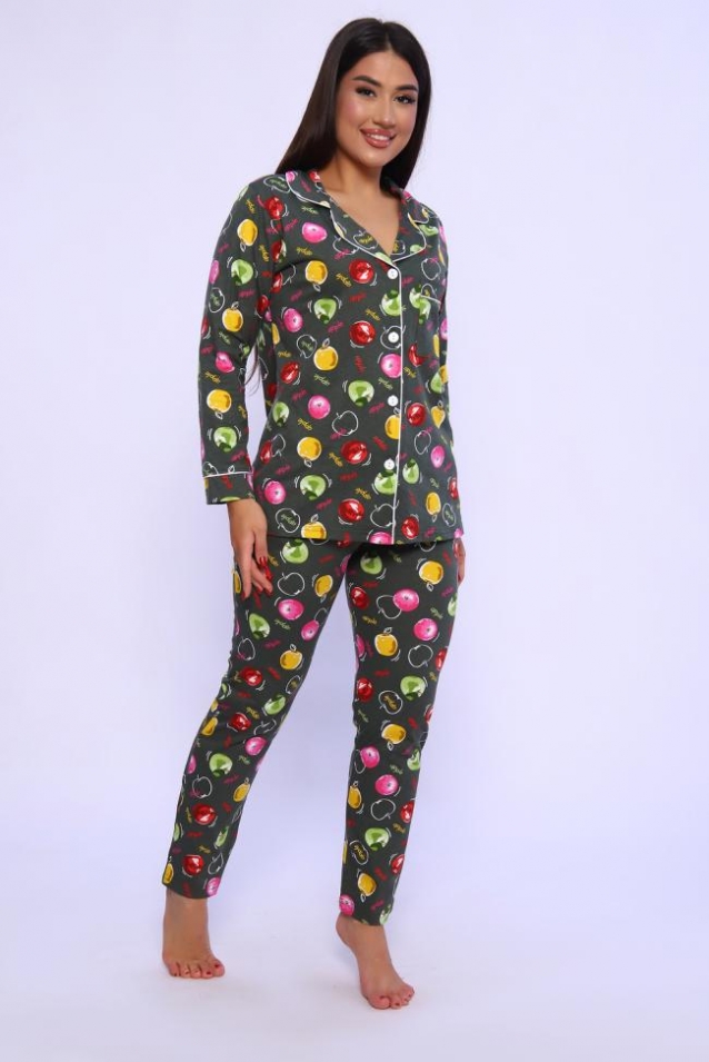 Пижама свободного кроя из мягкой хлопчатобумажной ткани. Комплект состоит из кофты и брюк. Кофта с длинным рукавом, на пуговках и с карманом на груди. Атласный кант по подборту, воротнику, карману и манжету. Брюки прямые с карманами. Эта пижама отлично подойдет как домашний костюм, так и для сна. А расцветка сочные яблоки поднимет настроение.