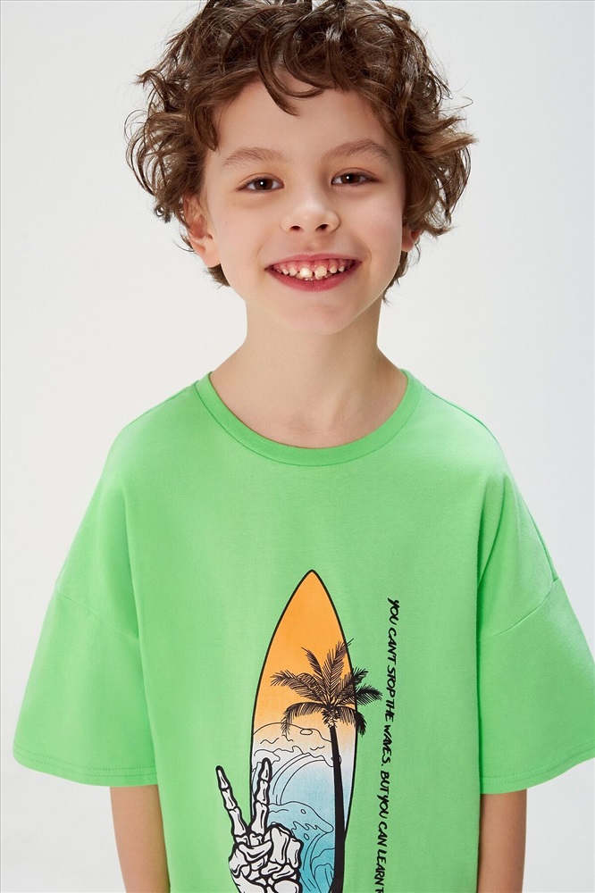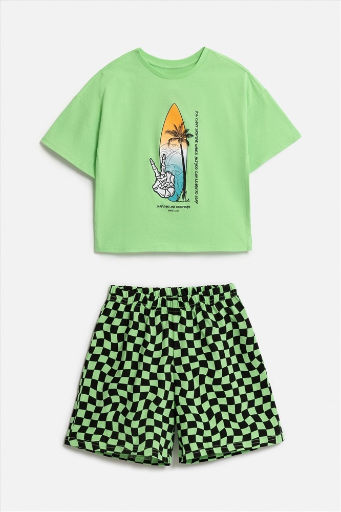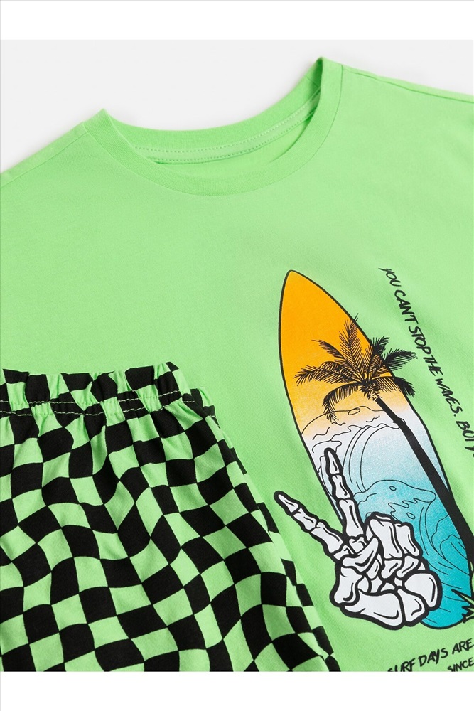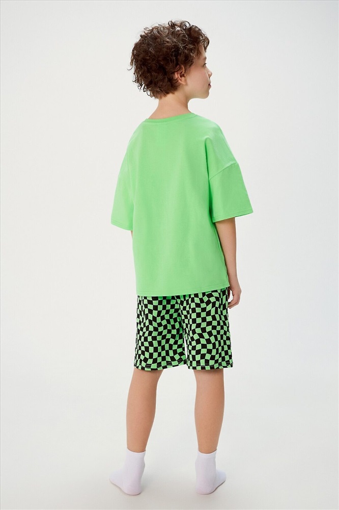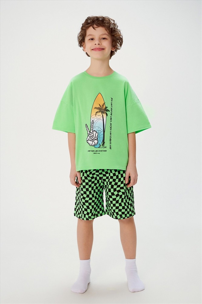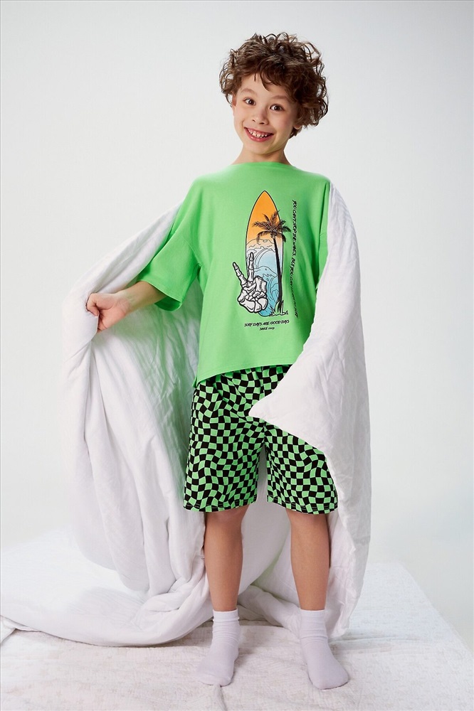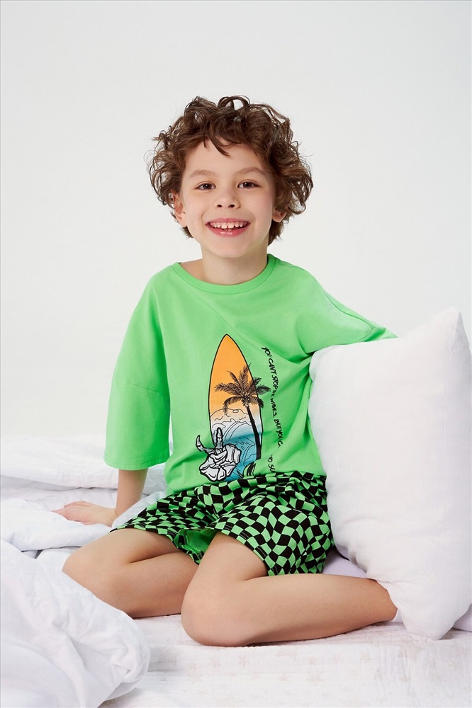 ID товара: 1038691 Состав: 100% Хлопок Сезон: Демисезон Длина: Средняя Фасон: Свободный Рукав: короткие Декоративные элементы: Принт Основная ткань: Хлопок Страна бренда: Россия Страна производства: Китай Пижама детская для мальчиков Zimovit зеленый Комментарии к товару