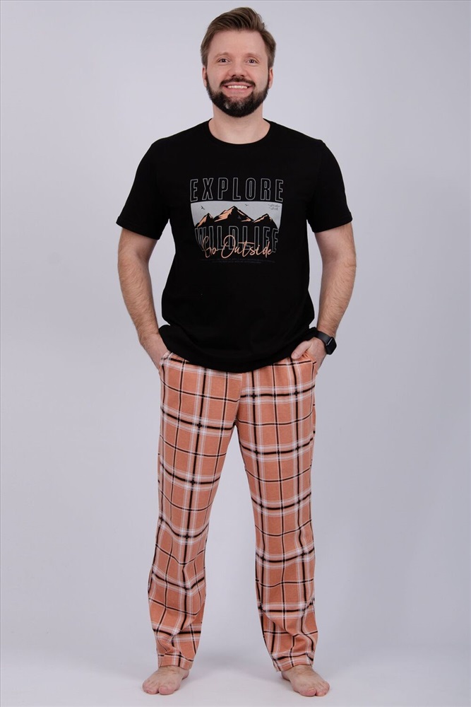 Пижама мужская: футболка прямого кроя с короткими рукавами с принтом на полочке, брюки прямые, с карманами в боковых швах.