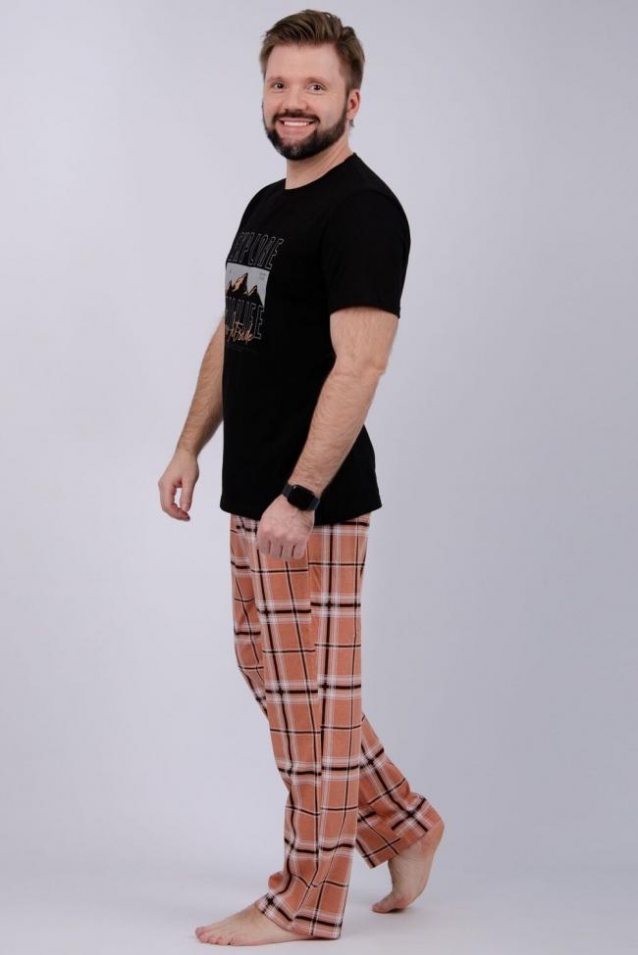 Пижама мужская: футболка прямого кроя с короткими рукавами с принтом на полочке, брюки прямые, с карманами в боковых швах.