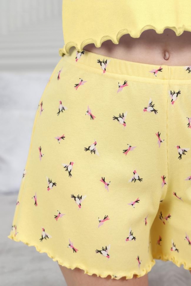 Пижама молодежная из трикотажного полотна «кашкорсе» в комбинации двух видов полотен: гладкокрашеной и с набивным рисунком, состоящая из майки-топа и шорт. Майка-топ – слегка расширенная книзу, на узких бретелях, с V-образным вырезом спереди и печатью на полочке, выполненной в технике «шелкографии». Низ изделия обработан узкой обметочной строчкой.Шорты - укороченные, с эластичной тесьмой по талии, расширенные книзу. Нижние срезы шорт обработаны узкой обметочной строчкой, создающей красивый волнистый край.