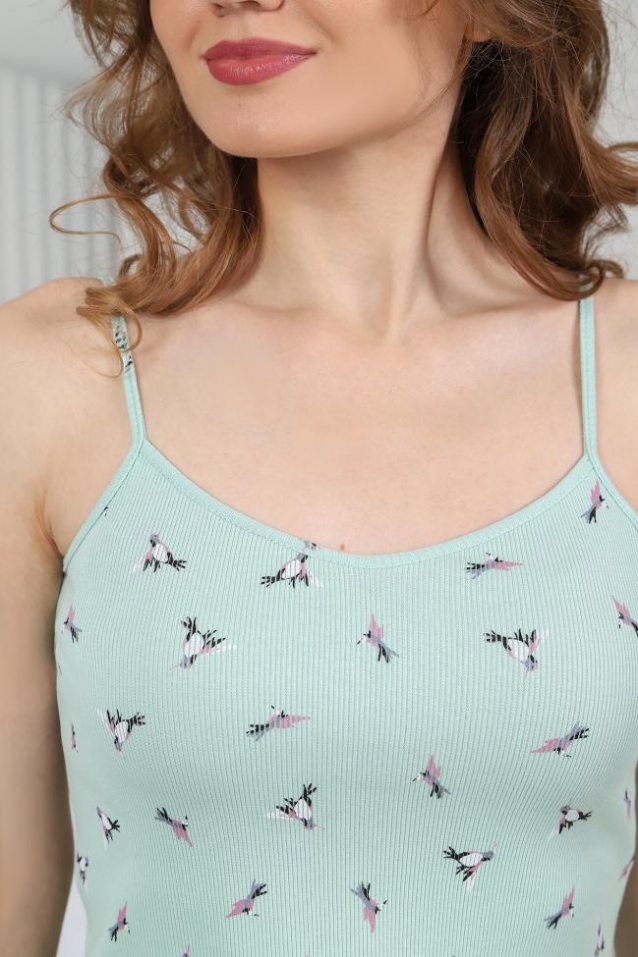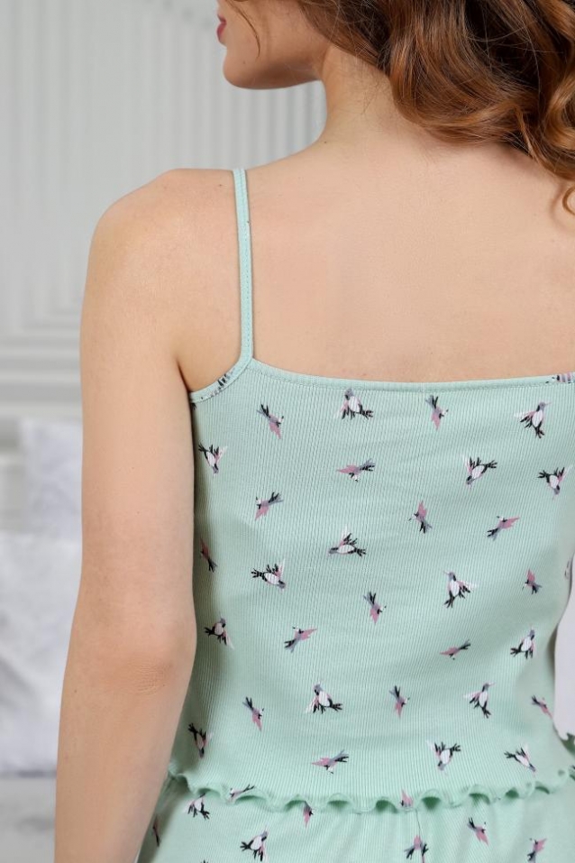 Пижама молодежная из трикотажного полотна «кашкорсе» с набивным рисунком, состоящая из майки-топа и шорт. Майка-топ – слегка расширенная книзу, на узких бретелях, с V-образным вырезом спереди. Низ изделия обработан узкой обметочной строчкой, горловина и проймы окантованы основным материалом.Шорты - укороченные, с эластичной тесьмой по талии, расширенные книзу. Нижние срезы шорт обработаны узкой обметочной строчкой, создающей красивый волнистый край.