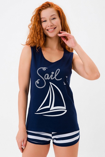 Майка полуприлегающего силуэта с округлым вырезом и короткими рукавами идеально сидит на теле. Белые полосы и маленький парусник украшают темно-синий фон.