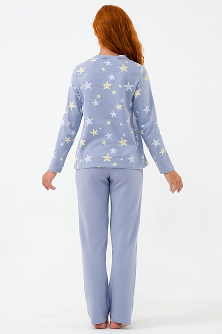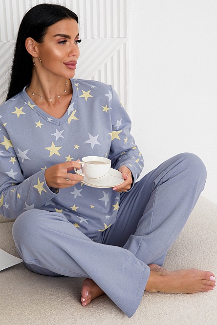 100% хлопок Тип ткани: футер 2-х нитка с начесом Женская пижама из мягкого футера, который дарит чувство уюта и нежности во время сна и домашнего отдыха. Пижама состоит из лонгслива и брюк. Лонгслив с V-образным вырезом, полуприлегающего силуэта с длинным рукавом. Брюки прямого кроя сосредней высотой посадки