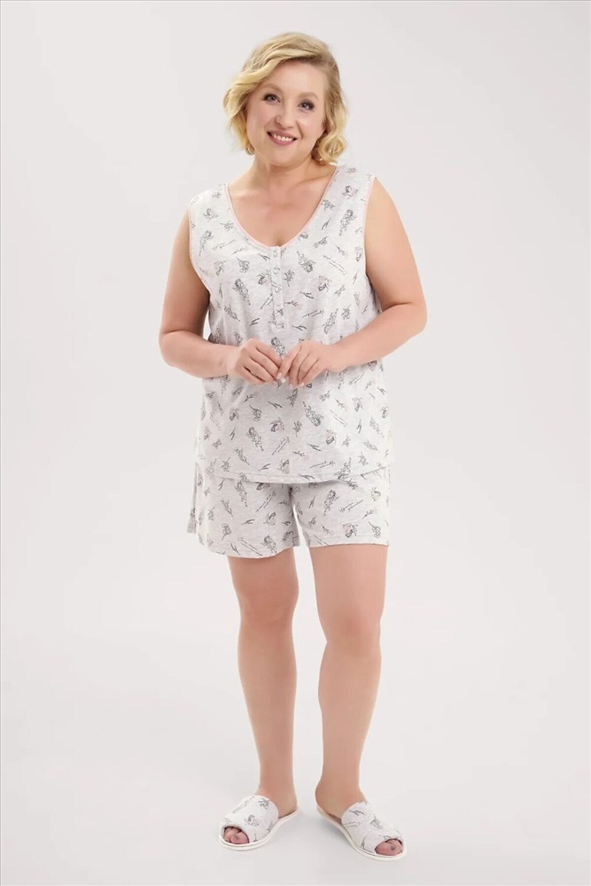 ID товара: 1136153 Состав: 51% Полиэстер, 49% Хлопок Сезон: Демисезон Длина: Средняя Фасон: Полуприлегающий Рукав: без рукавов Декоративные элементы: Принт Основная ткань: Полиэстер Страна бренда: Россия Страна производства: Россия Пижама из трикотажного полотна. Майка прямого силуэта. V-образная горловина, средняя ширина плеча. По горловине и пройме контрастная обтачка. По переду притачная планка с застежкой на пуговицы. Шорты на внутренней резинке. Комментарии к товару