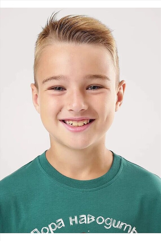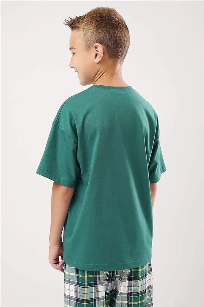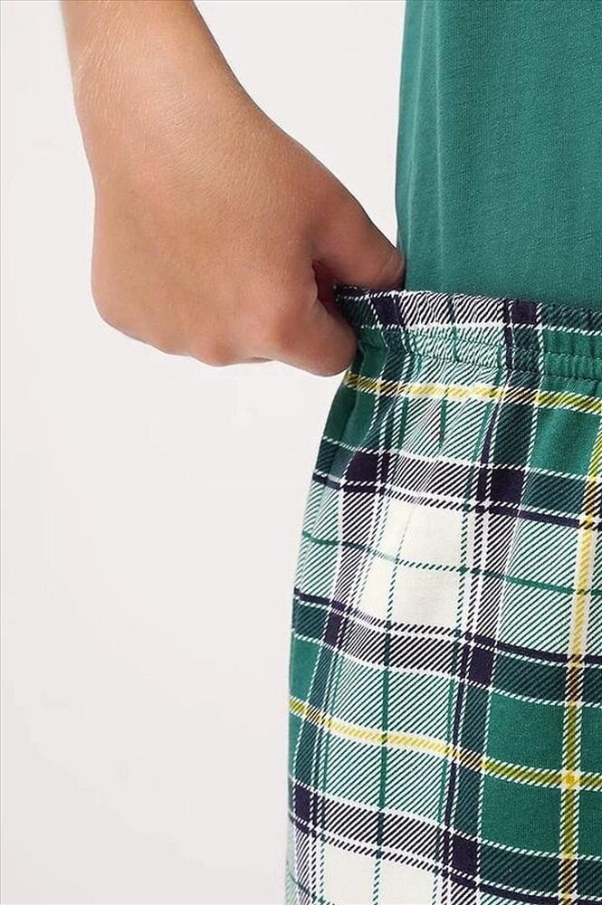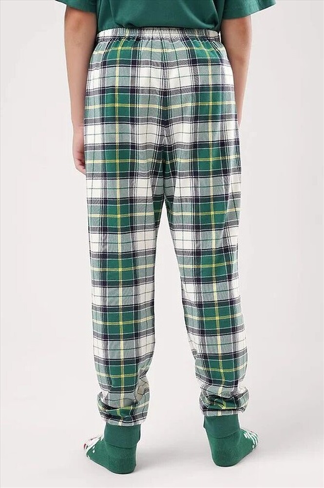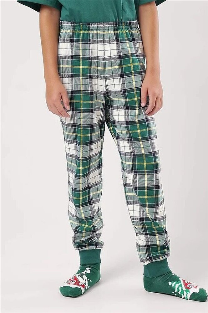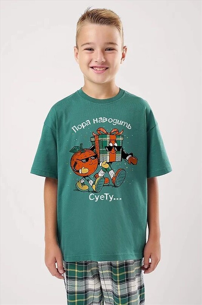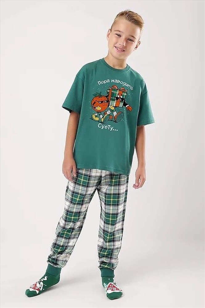 Новогодняя пижама для мальчика-подростка, состоящая из футболки и брюк. Футболка свободного кроя, с оригинальным тематическим принтом. Брюки среднего объема в клетку дополнены манжетами, которые обеспечат комфорт и идеальную посадку