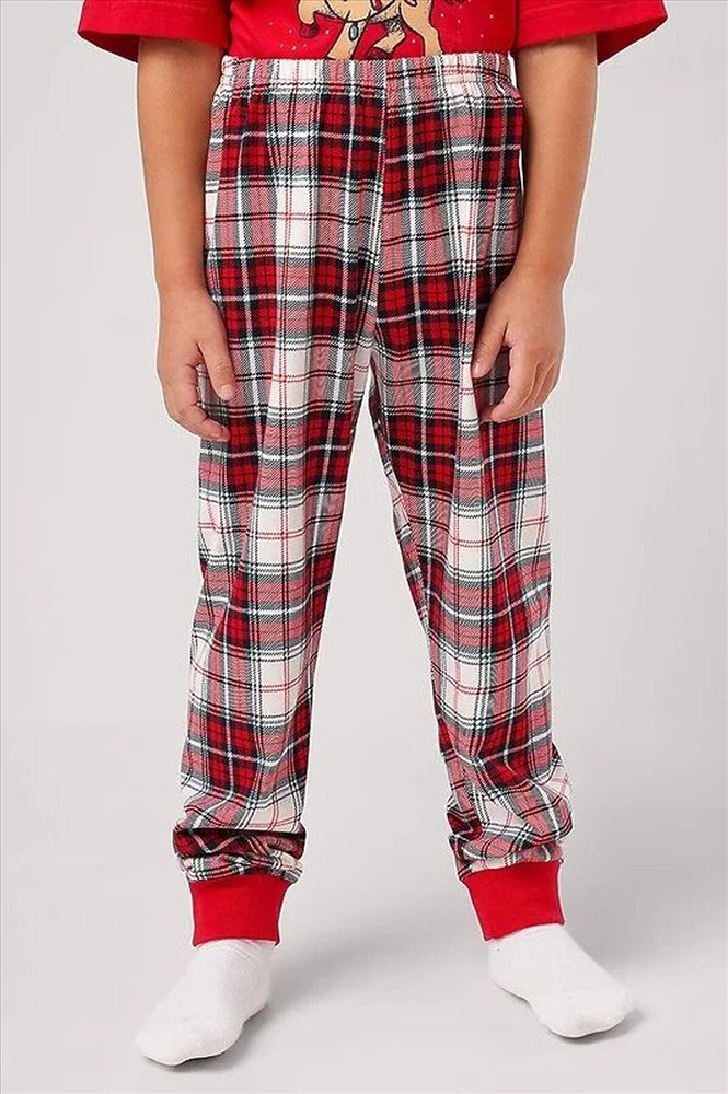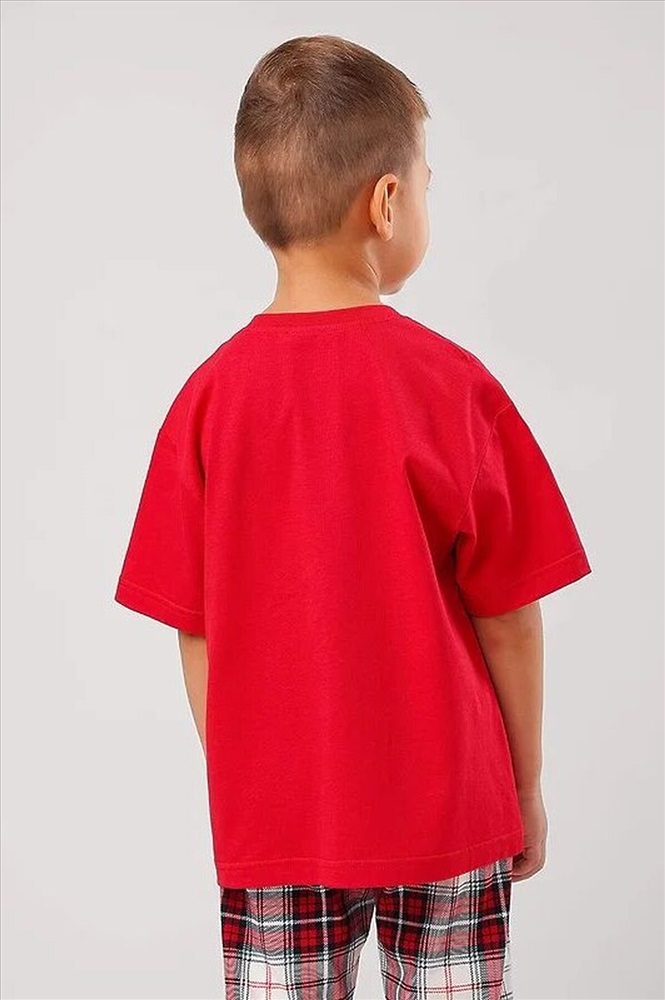 Новогодняя хлопковая пижама для мальчика, состоящая из футболки и брюк. Футболка свободного кроя дополнена оригинальным принтом спереди. Брюки умеренного объёма с эластичным удобным поясом, выполнены из хлопкового полотна в стильную клетку.