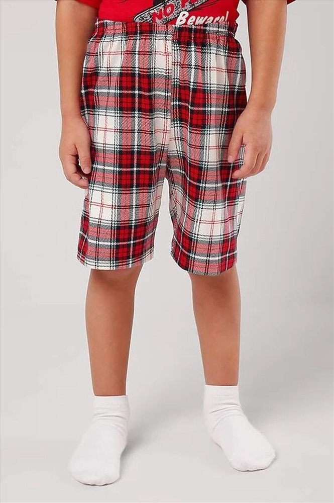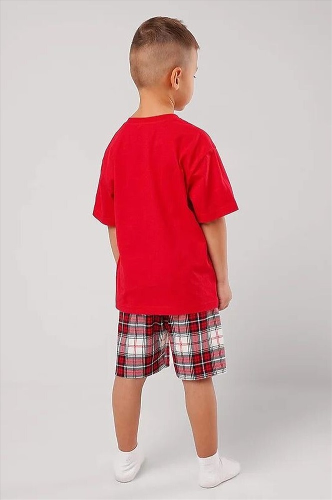 Новогодняя пижама для мальчика, состоящая из футболки и шорт. Стильная футболка свободного кроя дополнена оригинальным принтом. Шорты прямые средней длины с эластичным удобным поясом, выполнены из хлопкового полотна в клетку.