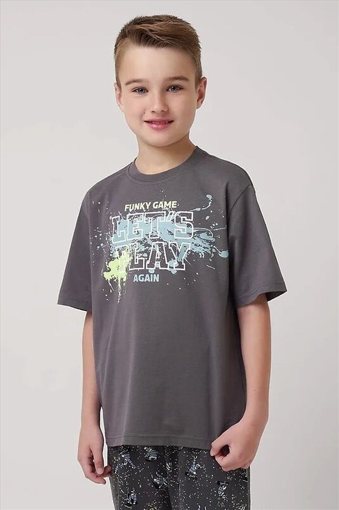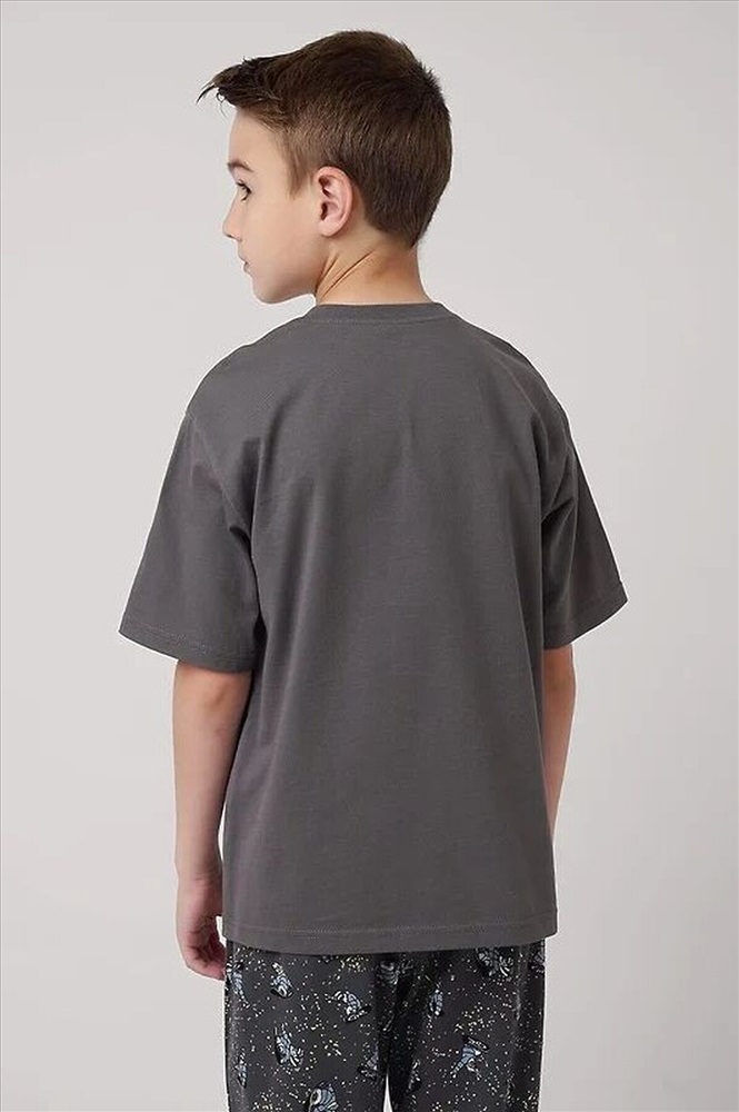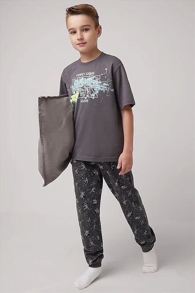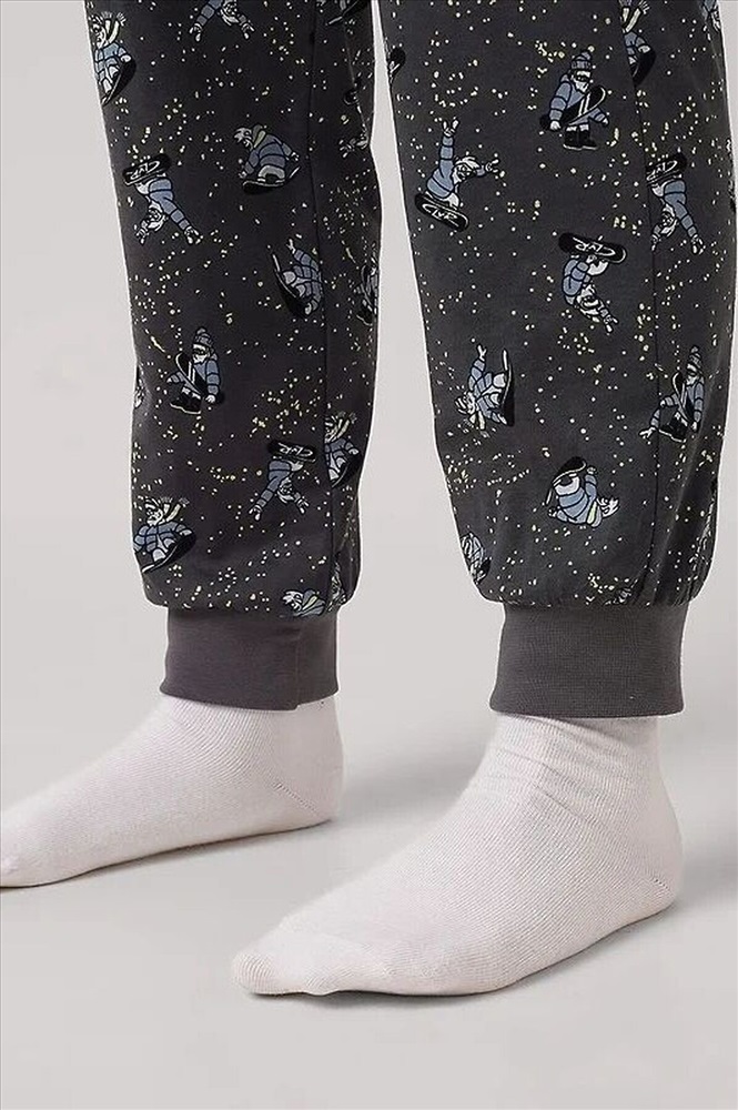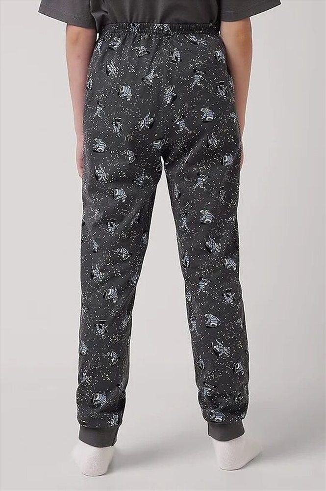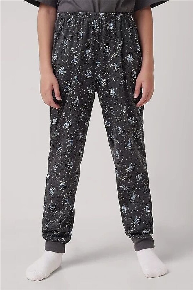 Комплект хлопковой пижамы из футболки и брюк. Футболка свободного кроя дополнена эластичной горловиной и стильным принтом. Брюки среднего объема, эластичный пояс обеспечит комфорт и идеальную посадку. По низу брюк эластичные манжеты.