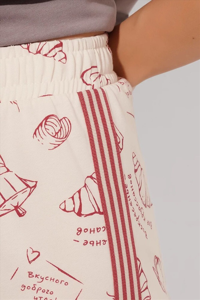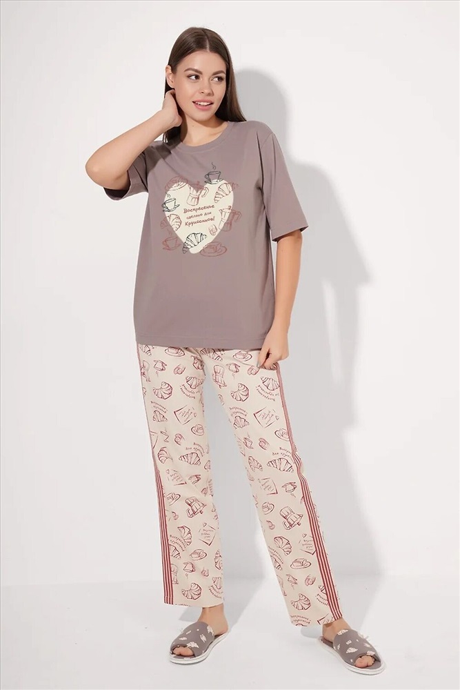 Набор одежды для дома и отдыха из хлопкового трикотажного полотна. Футболка прямого кроя. Короткий втачной рукав. Округлая горловина с обтачкой. Спереди принт. Брюки с поясом на внутренней резинке, по боковому шву -лампас из тесьмы, спереди нашивка.