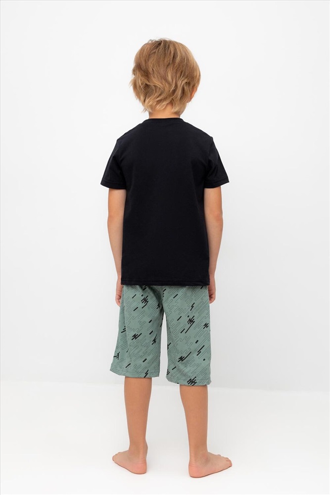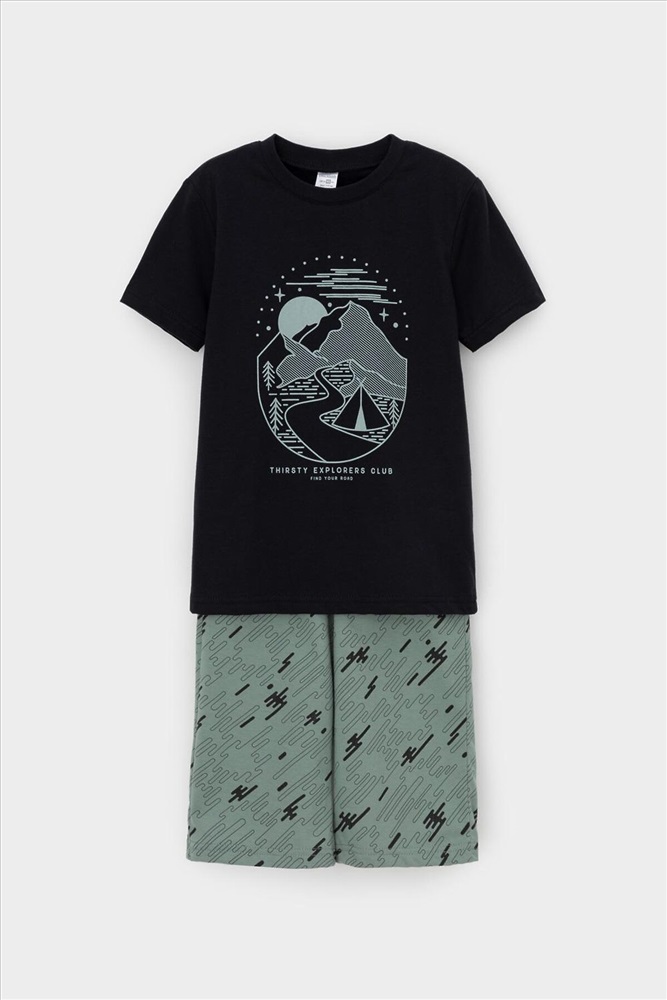 Страна производства: Россия Трикотажная пижама из натурального хлопка. Футболка с короткими рукавами с принтом . У шорт эластичный пояс на резинке. Оригинальная набивка выполнена из стойких, гипоаллергенных текстильных красителей. Пижама сохраняет цвет и форму после многократных стирок. Все трикотажные полотна производятся в соответсвии с нормами Швейцарского сертификата ЭкоТекс.