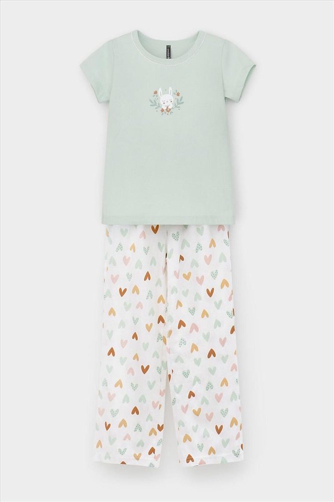 Трикотажная пижама из натурального хлопка. Футболка с короткими втачными рукавами и прямые брюки с эластичной резинкой в поясе. Оригинальные набивка и принт выполнены из стойких гипоаллергенных текстильных гипоаллергенных красителей. Изделие сохраняет цвет и форму после многократных стирок. Все трикотажные полотна производятся в соответсвии с нормами швейцарского сертификата ЭкоТекс.