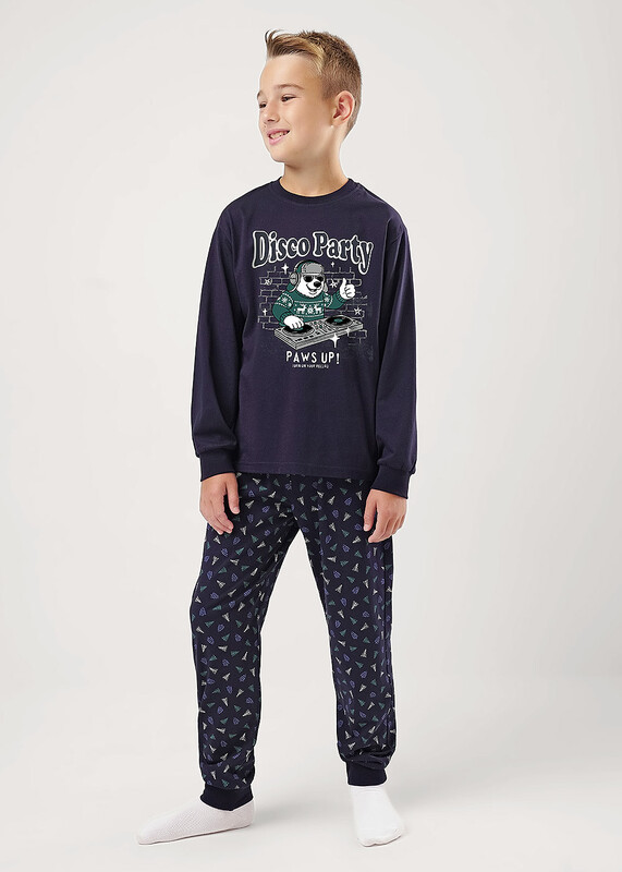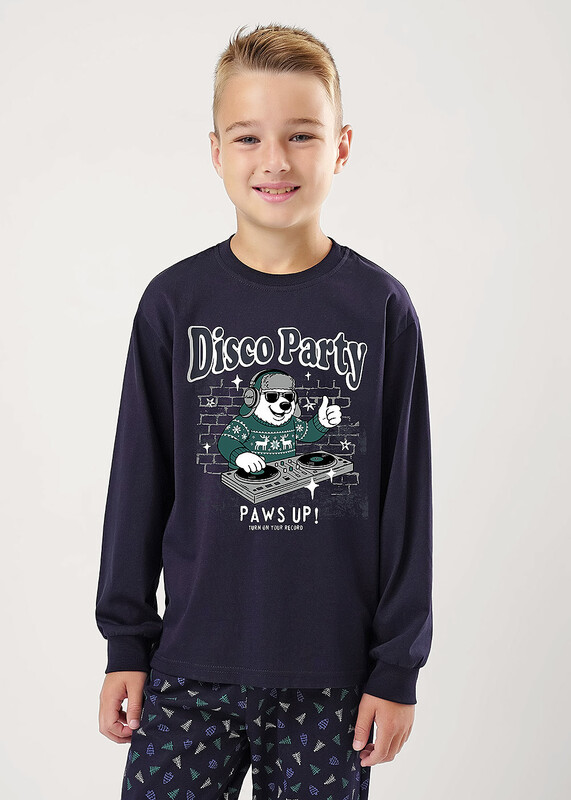 Новогодняя хлопковая пижама из джемпера и брюк. Горловина,манжеты по низу рукава и брюк из эластичного полотна. Лонгслив свободного кроя со спущенным плечом и крутым принтом. Брюки среднего объема, эластичный пояс обеспечит комфорт и идеальную посадку.
