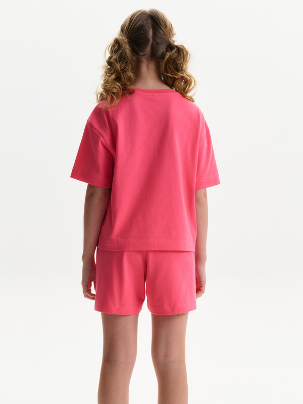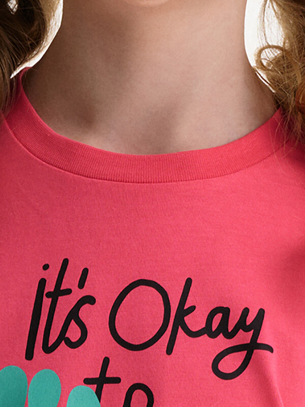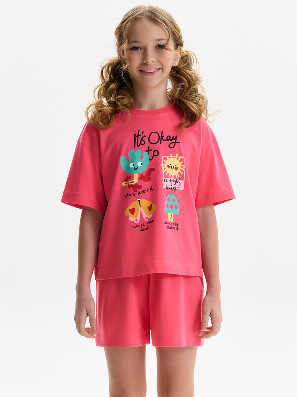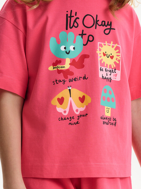 Детский пижамный костюм двойка - это мягкая укороченная футболка свободного кроя с коротким рукавом и широкие удлиненные шорты, выполненные из натуральных материалов. Пижама для девочки изготовлена из 100% хлопка. Широкая и мягкая резинка в поясе шортов не перекручивается и не давит. Отделка горловины из эластичной рибаны — она не растягивается, ребёнку удобно надевать и снимать пижаму.  Переводы текстов: IT’S OKAY TO - *ЭТО НОРМАЛЬНО; stay weird - *оставаться странным; be bright & happy - *быть ярким и счастливым; change your mind - *менять свое мнение; always be yourself - *всегда оставаться самим собой.