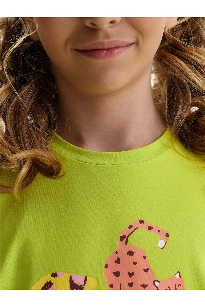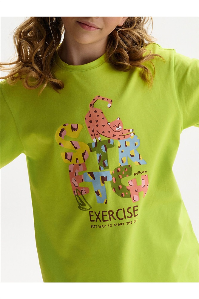 Детский пижамный костюм двойка - это удлиненная футболка с коротким рукавом и удобные велосипедки, выполненные из натуральных материалов. Пижама для девочки изготовлена из 100% хлопка. Футболка умеренного объема, плечо немного спущено, рукава широкие. Широкая и мягкая резинка в поясе велосипедок не перекручивается и не давит. Отделка горловины из эластичной рибаны — она не растягивается, ребёнку удобно надевать и снимать пижаму. Перевод принта: "УПРАЖНЕНИЕ на РАСТЯЖКУ - лучший способ начать день"