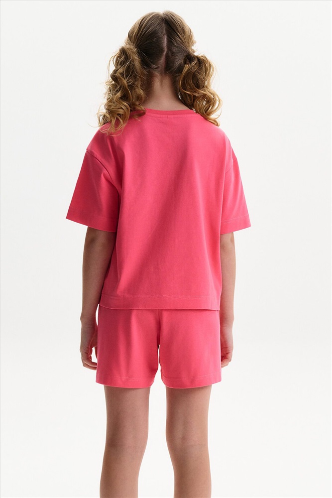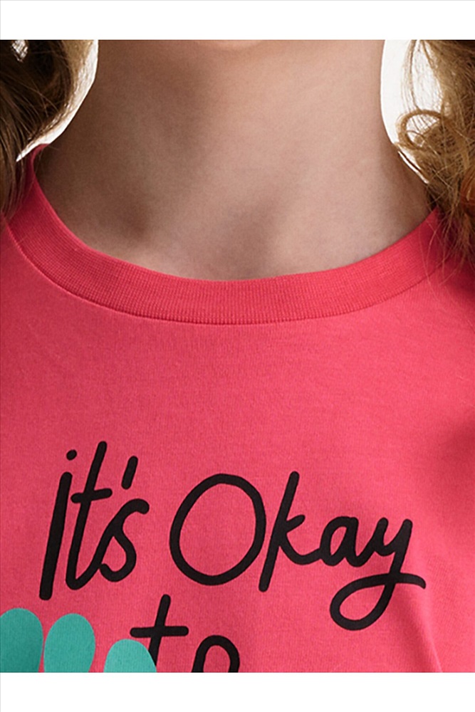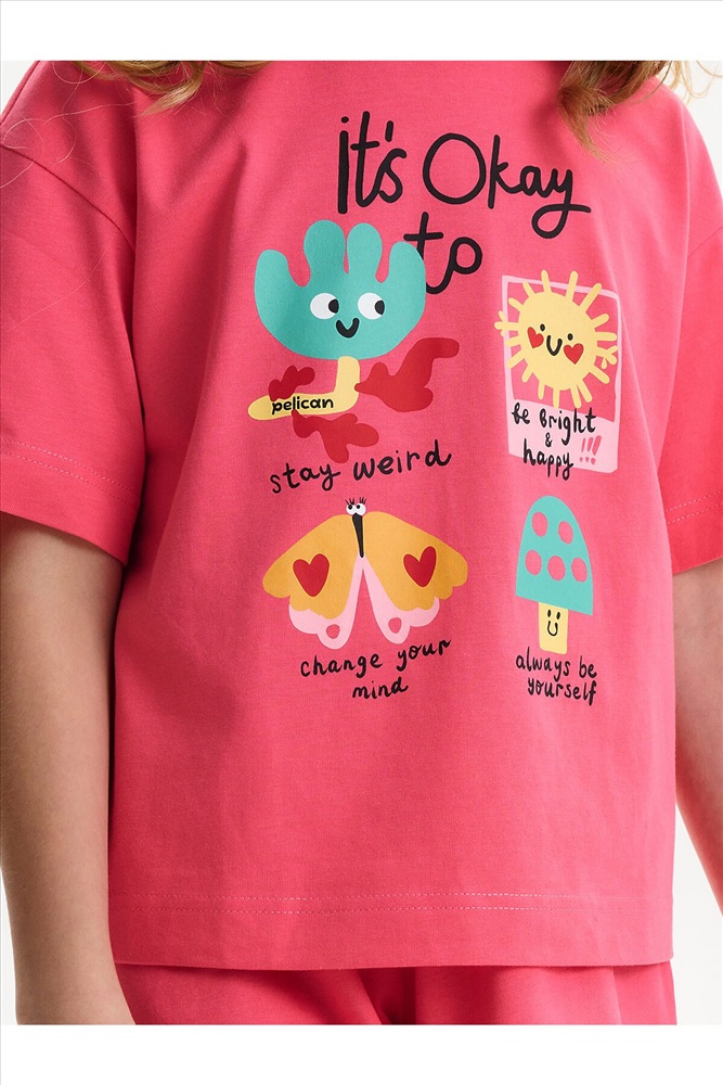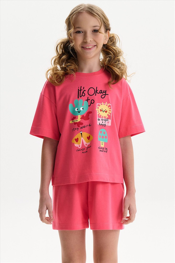Детский пижамный костюм двойка - это мягкая укороченная футболка свободного кроя с коротким рукавом и широкие удлиненные шорты, выполненные из натуральных материалов. Пижама для девочки изготовлена из 100% хлопка. Широкая и мягкая резинка в поясе шортов не перекручивается и не давит. Отделка горловины из эластичной рибаны — она не растягивается, ребёнку удобно надевать и снимать пижаму. Переводы текстов: IT’S OKAY TO - *ЭТО НОРМАЛЬНО: stay weird - *оставаться странным: be bright & happy - *быть ярким и счастливым: change your mind - *менять свое мнение: always be yourself - *всегда оставаться самим собой.