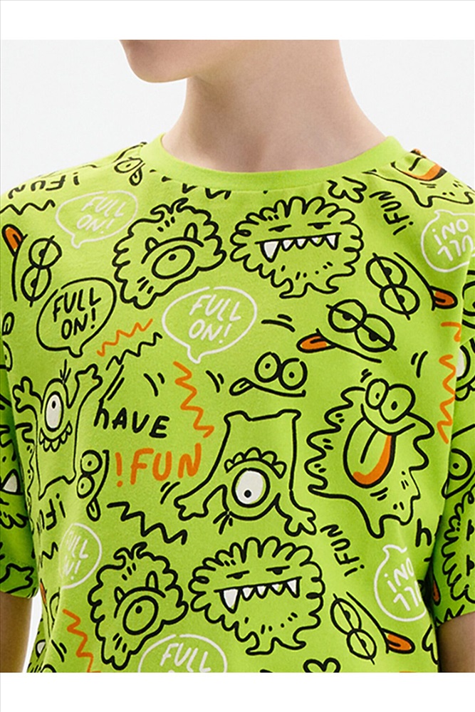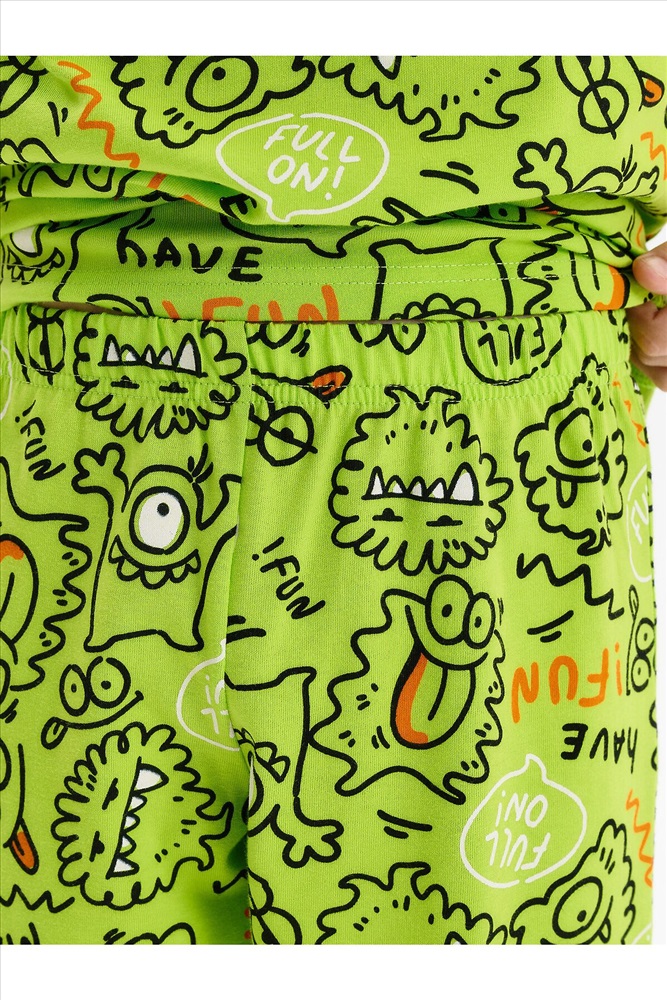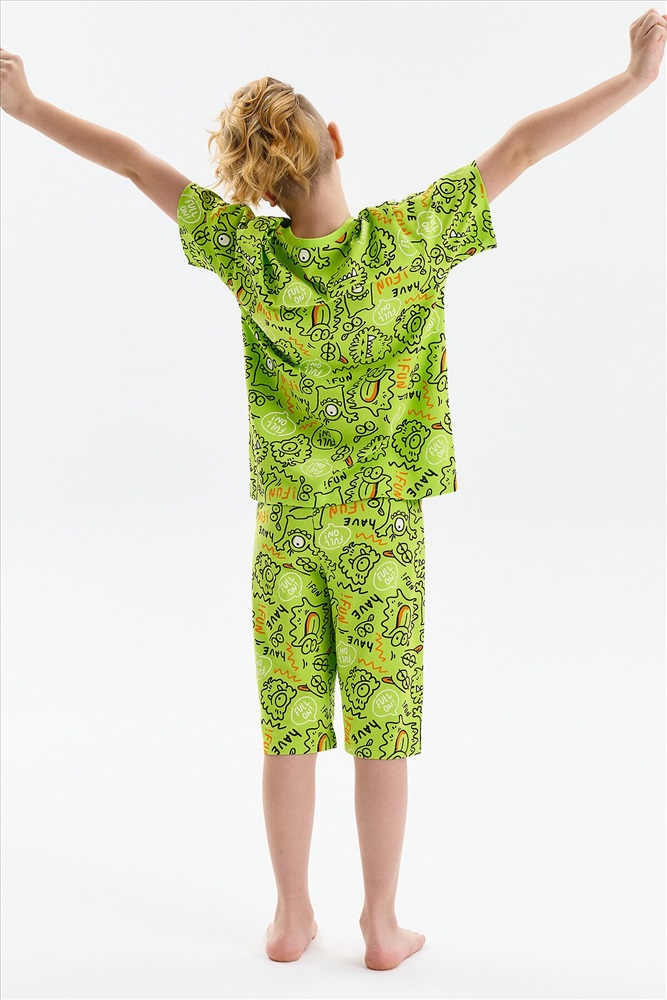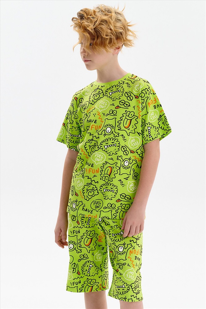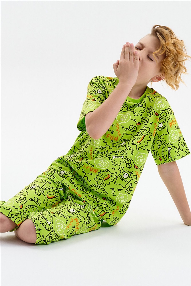 Стильная и уютная пижама для мальчика. В составе ткани 100% хлопка — идеально для детской домашней одежды! Футболка и удлиненные шорты, плечо спущено, рукава широкие и свободные — пижама на мальчика очень удобна для сна. Широкая и мягкая резинка в поясе шортов не перекручивается и не давит. Отделка горловины из эластичной рибаны — она не растягивается, ребёнку удобно надевать и снимать пижаму. Перевод надписей: "веселиться"