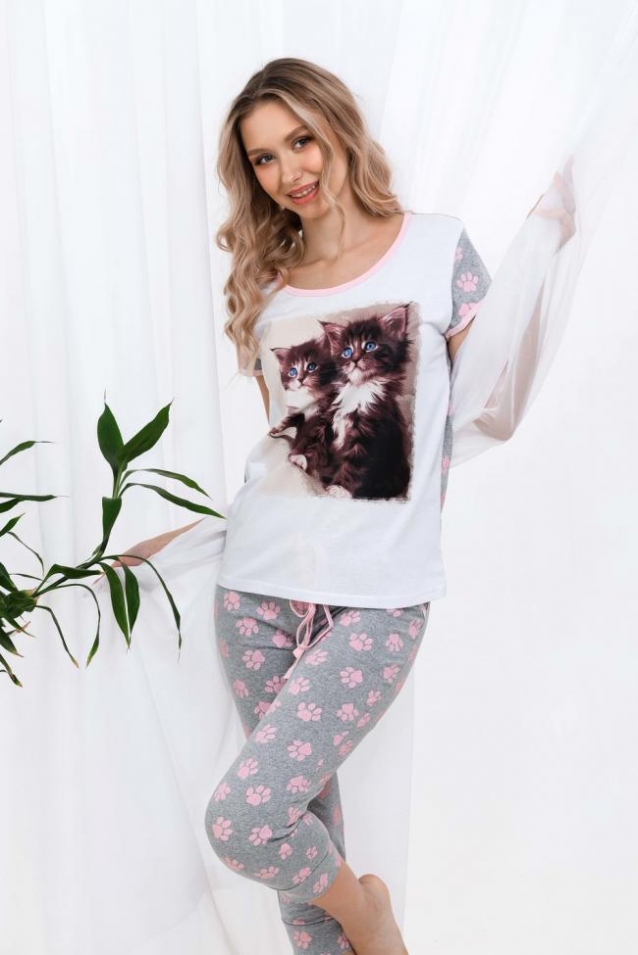 Пижама из кулирки футболка + бриджи. Светлая футболка с розовой окантовкой, принт в виде котят, серые вставки с кошачьими следами. Серые бриджи с узором в виде следов, розовая окантовка карманов, шнурок на поясе, длина чуть ниже коленей.
