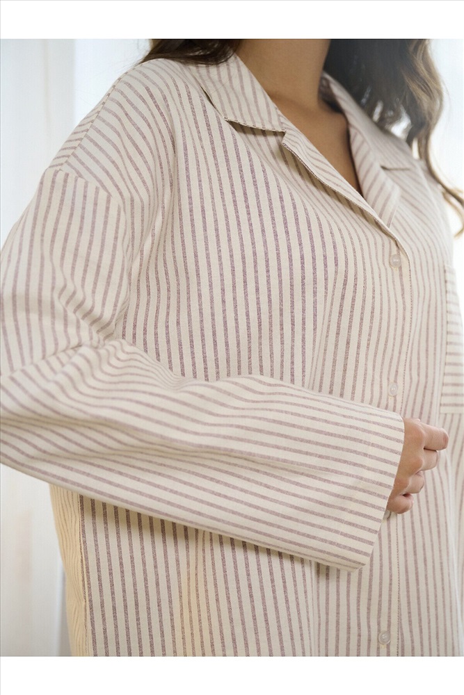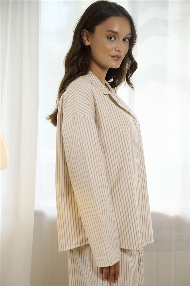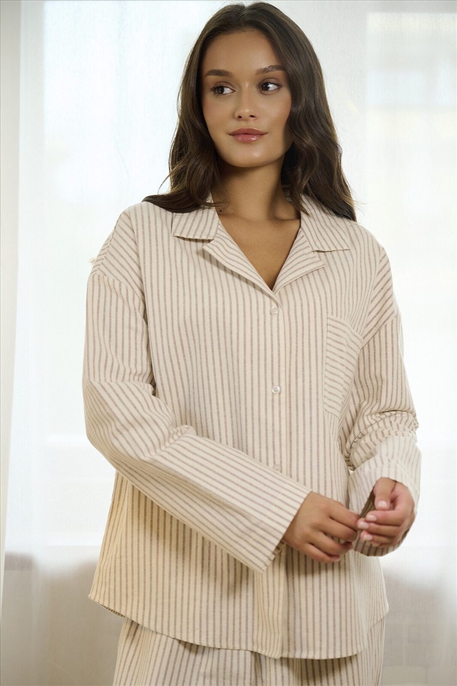 ID товара: 1218417 Состав: 100% Хлопок Сезон: Демисезон Длина: Полная Фасон: Свободный Рукав: Длинные Вид застежки: Пуговицы Декоративные элементы: Принт Основная ткань: Хлопок Страна бренда: Россия Страна производства: Китай В комплект входит рубашка и брюки в нежную вертикальную полоску. Рубашка свободного кроя с длинными рукавами, отложным воротником и пуговицами спереди. На груди расположен накладной карман, повторяющий основной принт. Брюки прямого кроя с эластичной резинкой на поясе, обеспечивают комфортную посадку. Широкие штанины и мягкая ткань делают их особенно удобными для сна и домашнего времяпрепровождения. Пижама идеально подходит для домашнего отдыха и сна, обеспечивая комфорт и приятные тактильные ощущения. Комментарии к товару