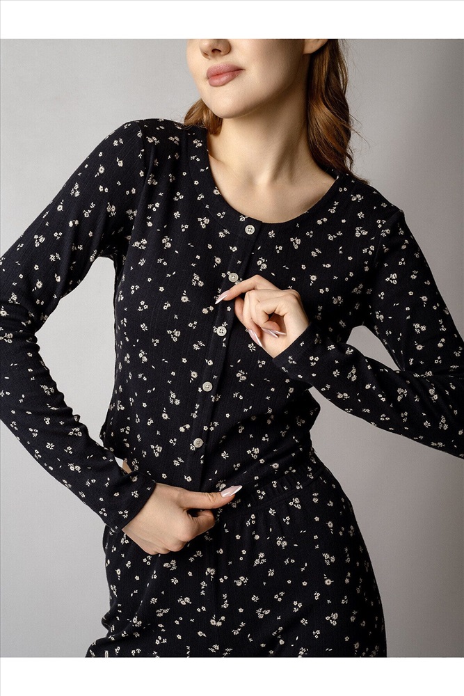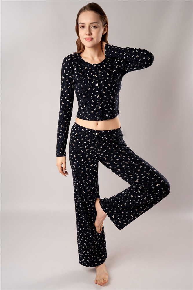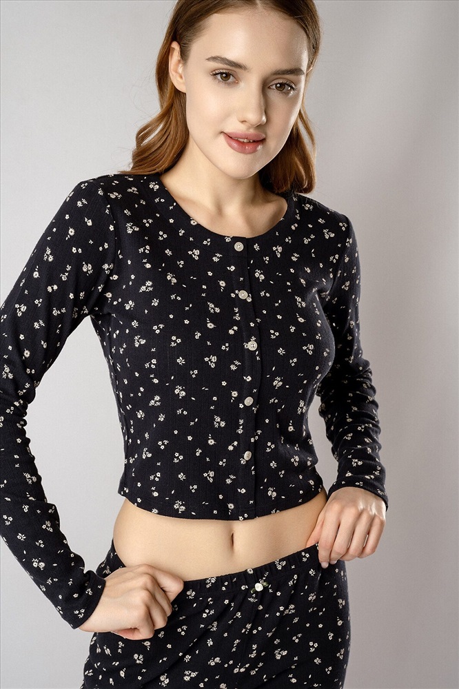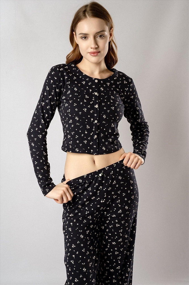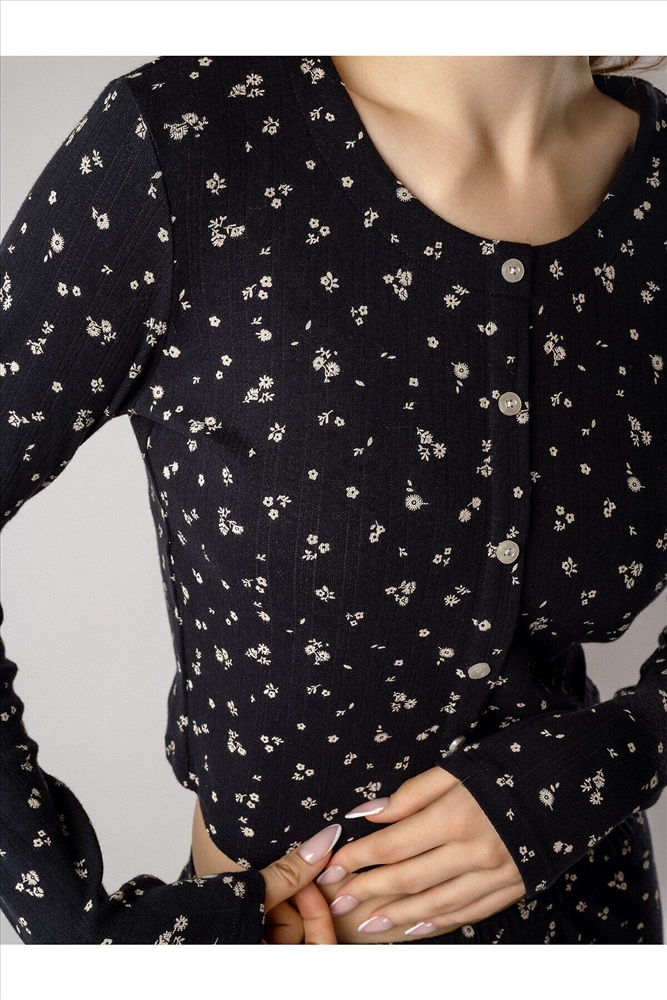 Страна производства: Китай Кофта с длинными рукавами украшена рядом декоративных пуговиц на груди. Брюки дополнены «розочкой» на поясе — выразительным элементом, который придает модели романтичный характер. Глубокий чёрный цвет в сочетании с нежным цветочным принтом создаёт утончённый образ, гармонично соединяя сдержанную элегантность и женственность.