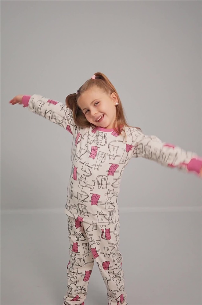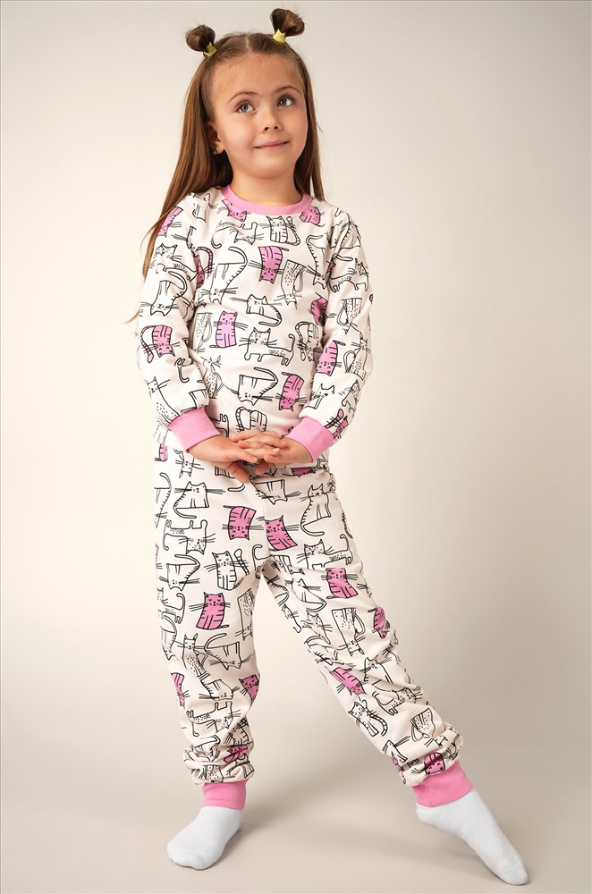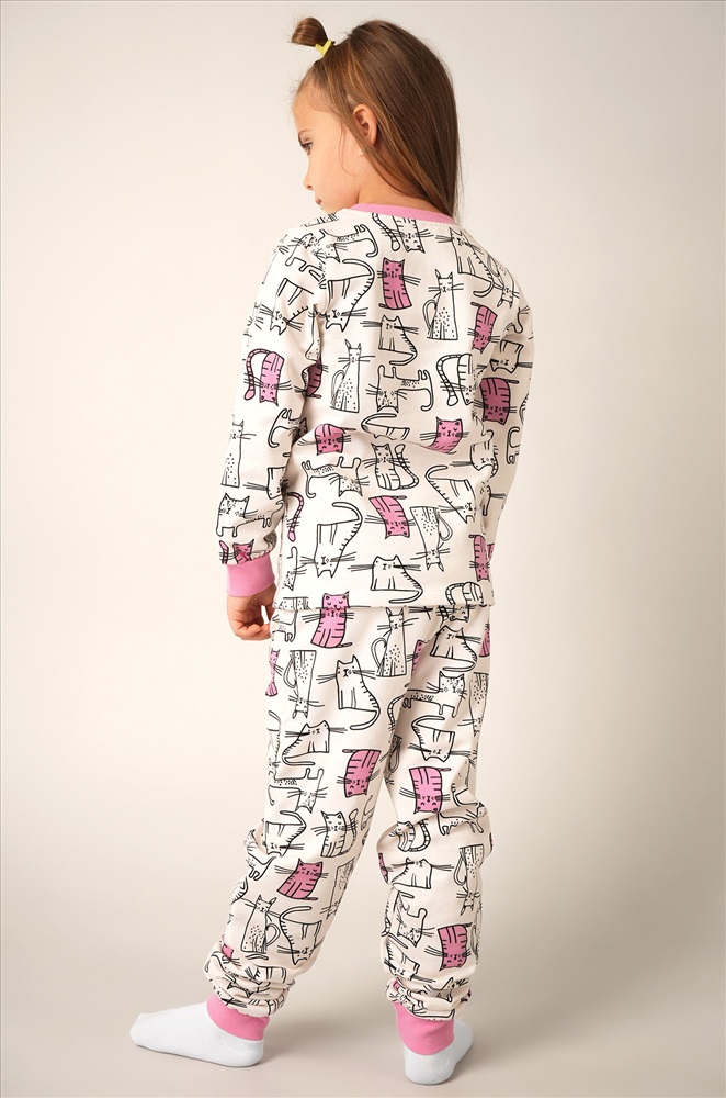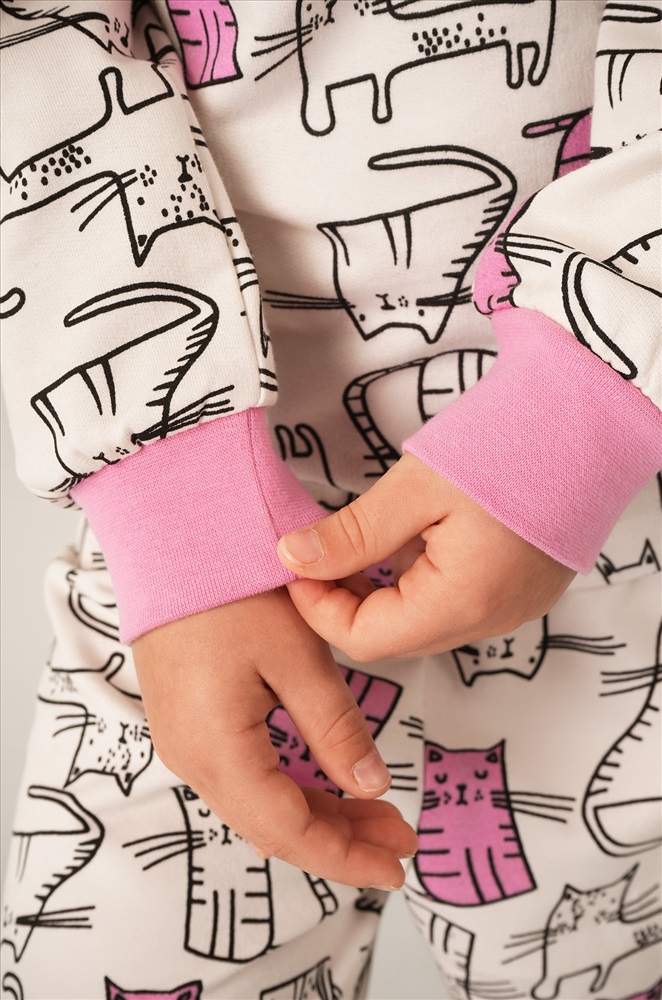 Теплая пижама с брюками для девочек выполнена из 100% хлопка. Футер с начесом делает её особенно мягкой и теплой. Спокойный молочный цвет и веселый принт с котиками создают уютную атмосферу и поднимают настроение.