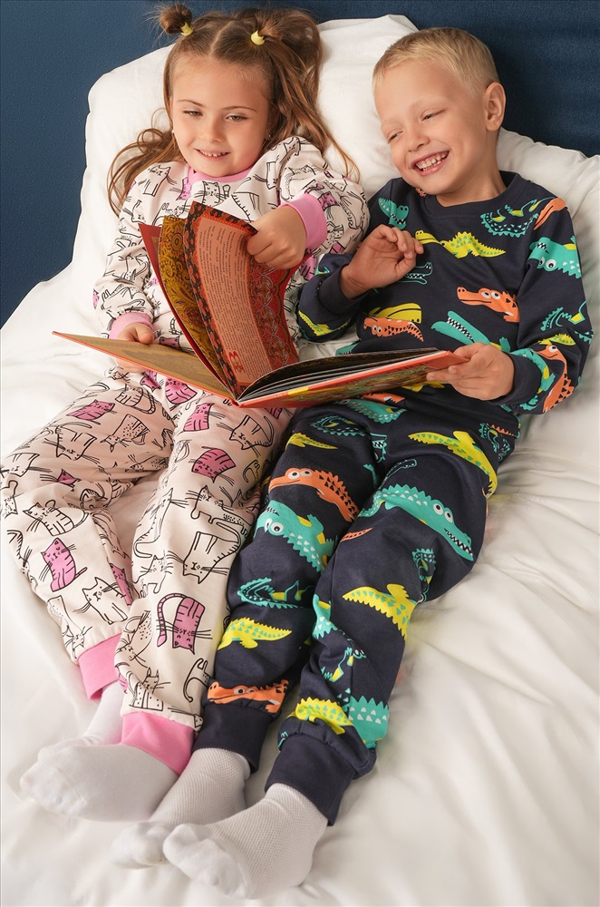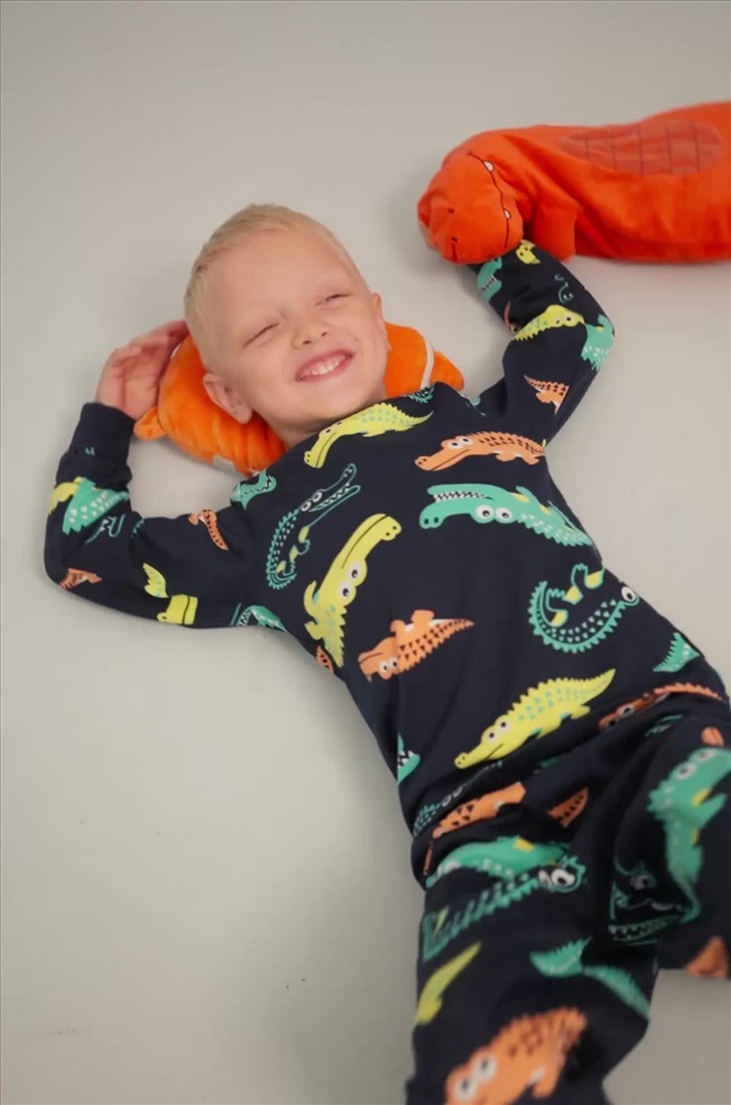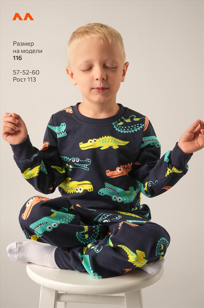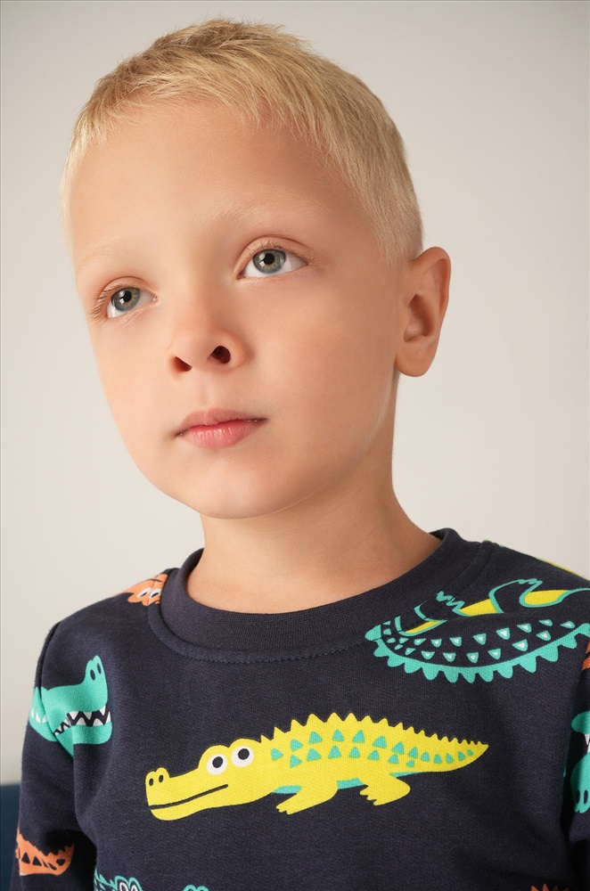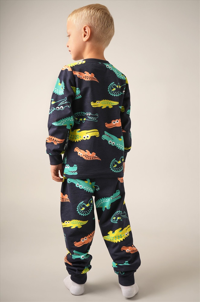 Теплая пижама с брюками для мальчиков выполнена из 100% хлопка. Футер с начесом делает её особенно мягкой и теплой. Спокойный синий цвет и веселый принт с крокодилами создают уютную атмосферу и поднимают настроение.