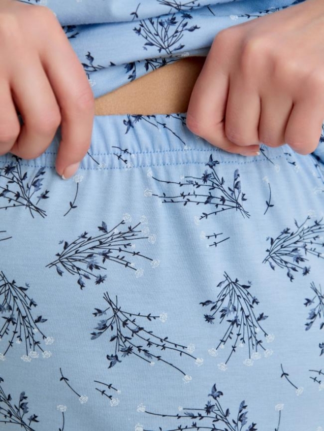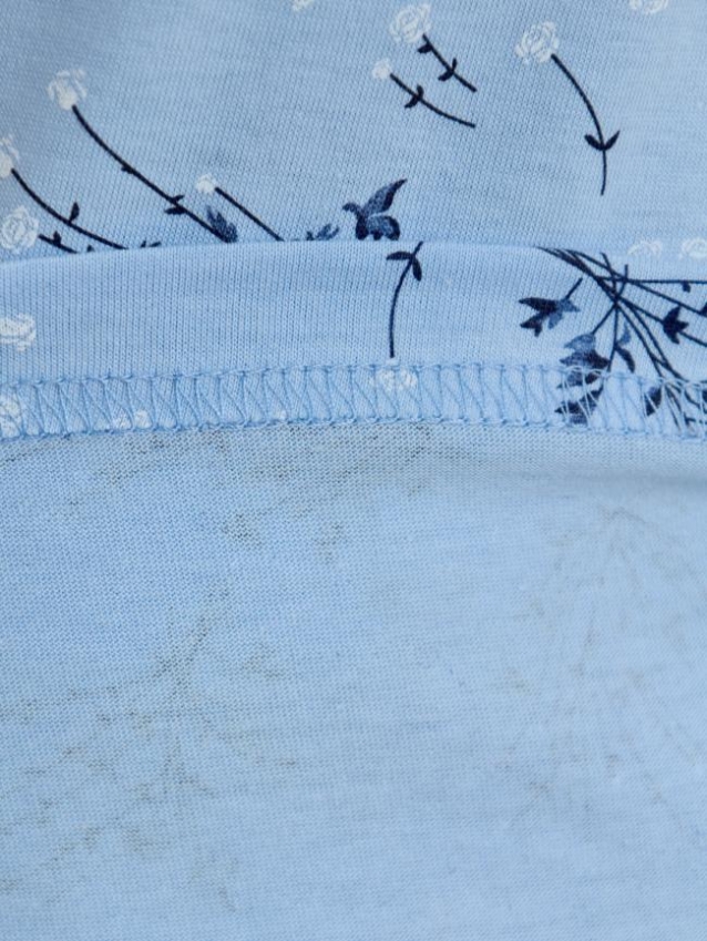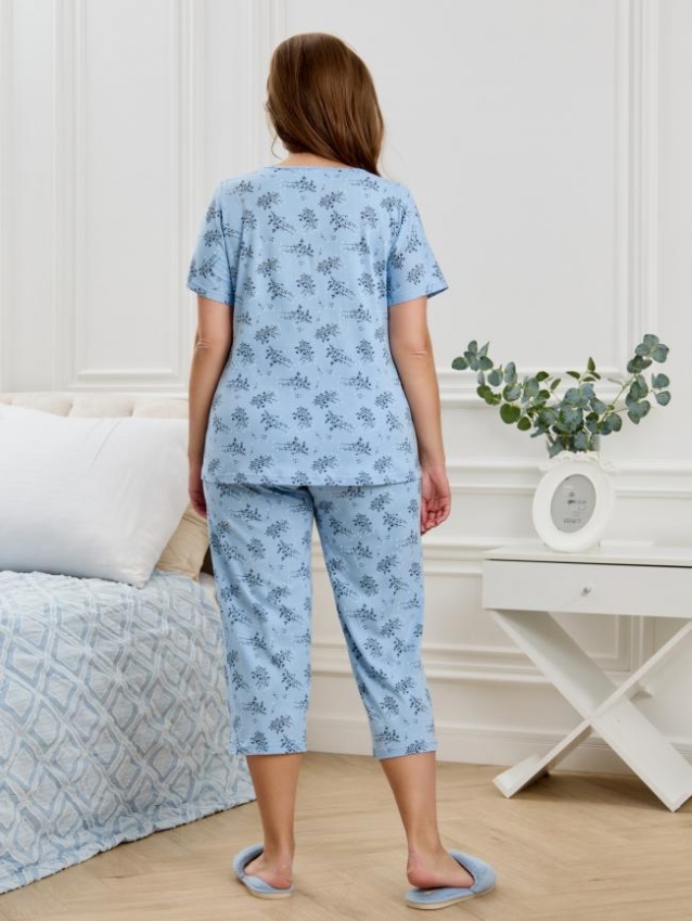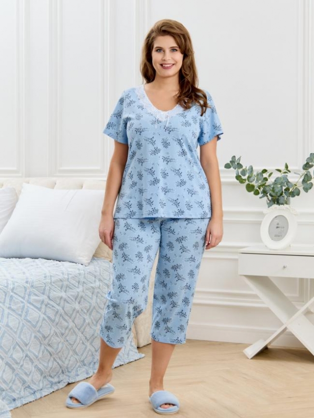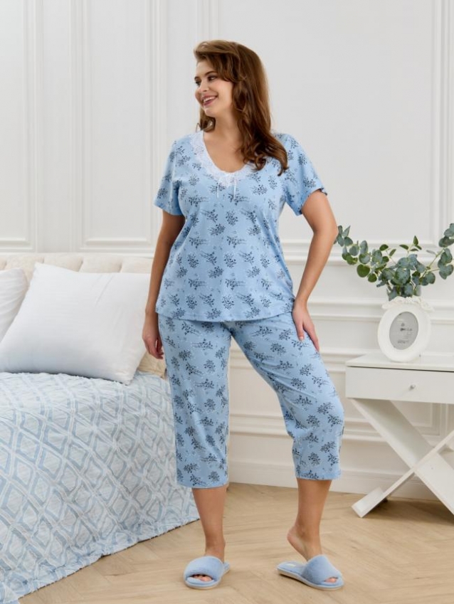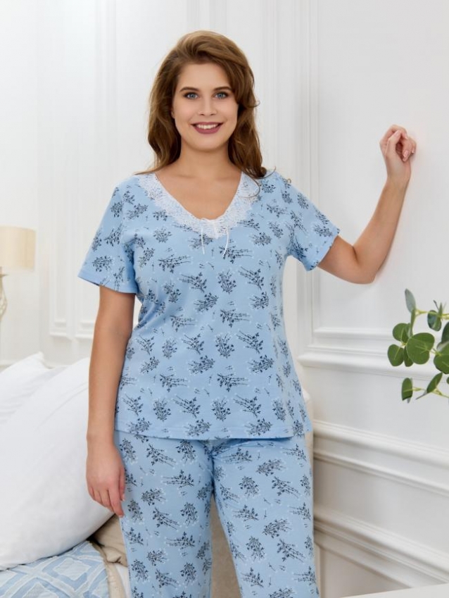 Пижама женская из трикотажного полотна «кулирка» с набивным рисунком, состоящая из футболки и бридж. Футболка прямого кроя, с короткими втачными рукавами. Горловина V- образной формы, обработана кружевом с фестонным краем, по центру настрочен декоративный бантик из узкой атласной тесьмы.Бриджи свободные, длиной до середины икры, с эластичной тесьмой по талии. Комментарии к товару