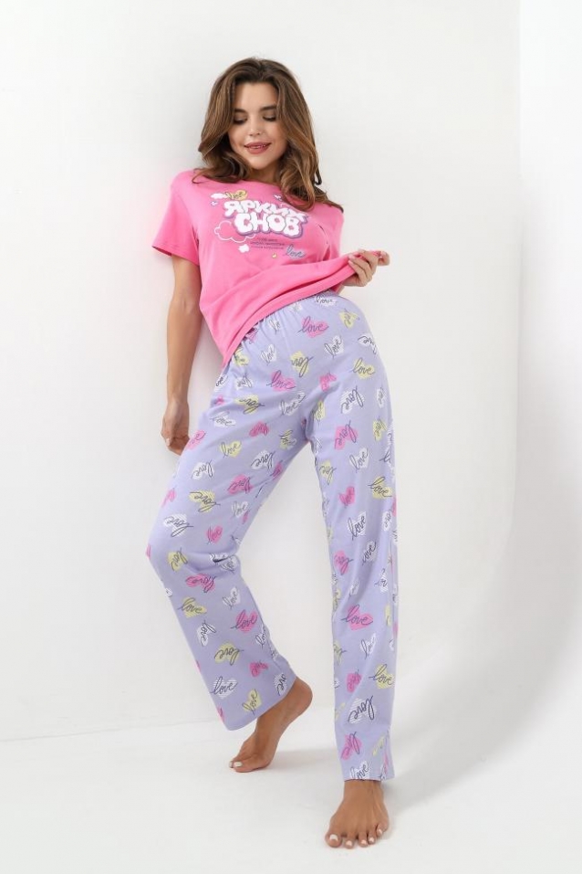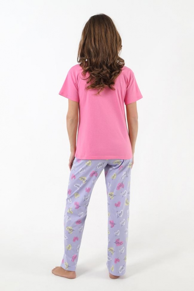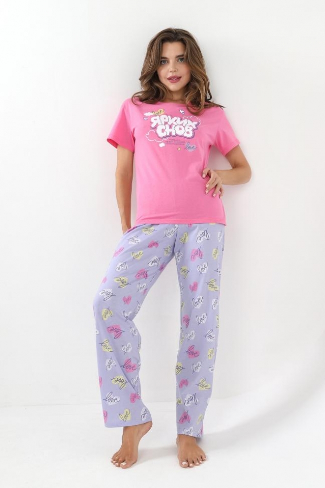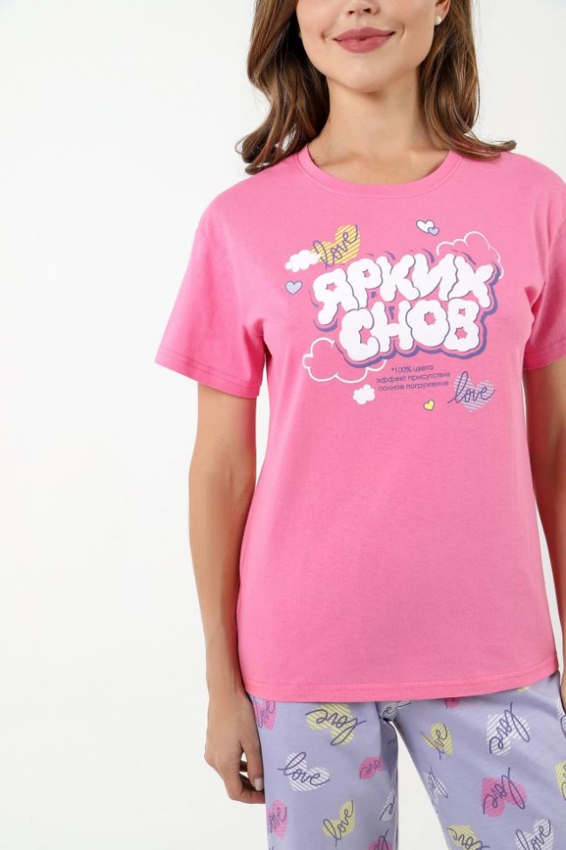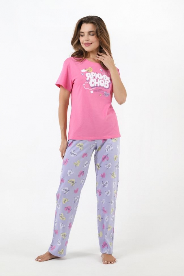 Пижама молодежная из трикотажного полотна «кулирка» в комбинации двух видов: гладкокрашеного и с набивным рисунком, состоящая из футболки и брюк. Футболка – из гладкокрашеного полотна, классического покроя, с короткими втачными рукавами, горловиной овальной формы, обработанной притачной бейкой и принтом на полочке, выполненным в технике «шелкографии».Брюки – из полотна с набивным рисунком, классического покроя, с эластичной тесьмой по талии. Комментарии к товару