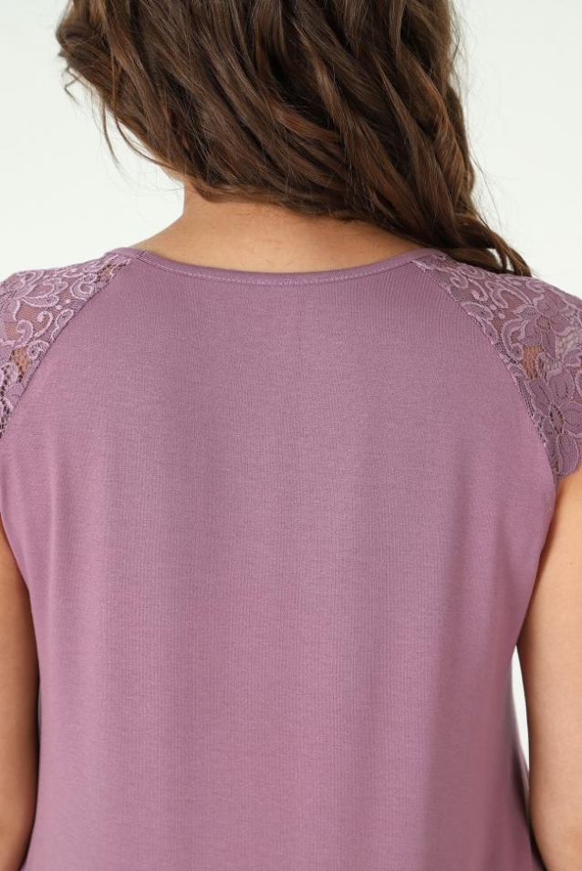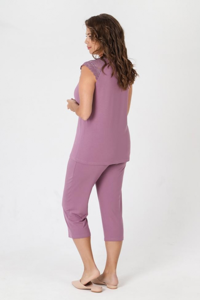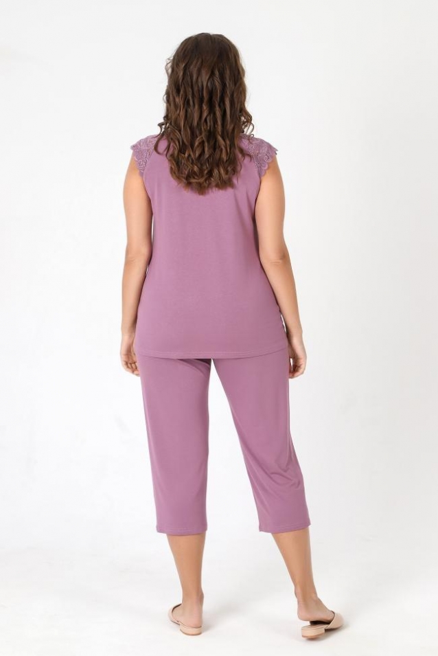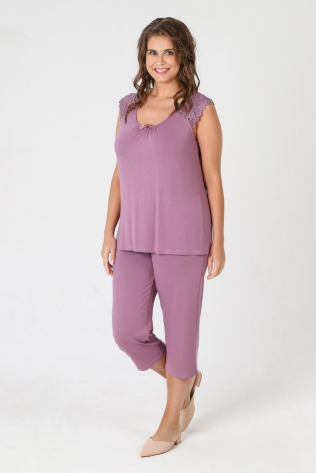Пижама - женская из трикотажного гладкокрашенного вискозного полотна, состоящая из футболки и бридж. Футболка - слегка расширенная книзу, с короткими кружевными рукавами покроя «реглан» и горловиной овальной формы, окантованной основным материалом. По срезу горловины выполнена небольшая сборка, по центру декоративный бантик из узкой атласной ленты.Бриджи – свободного покроя, с эластичной тесьмой по талии. Комментарии к товару