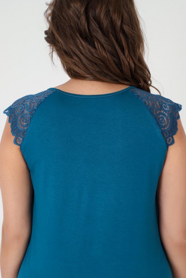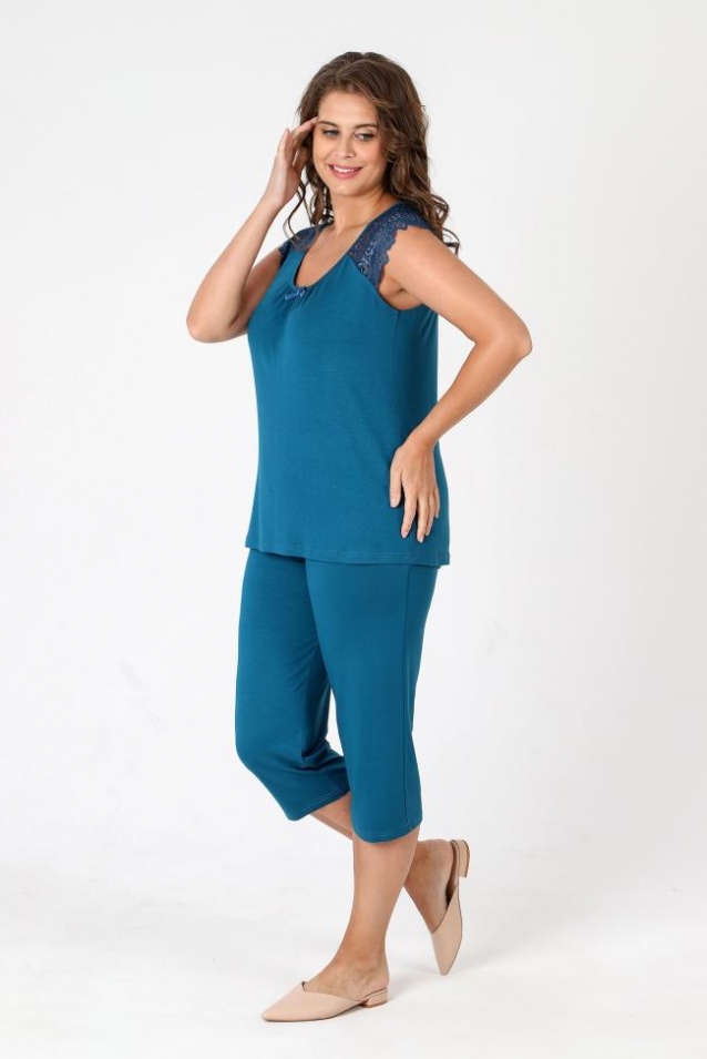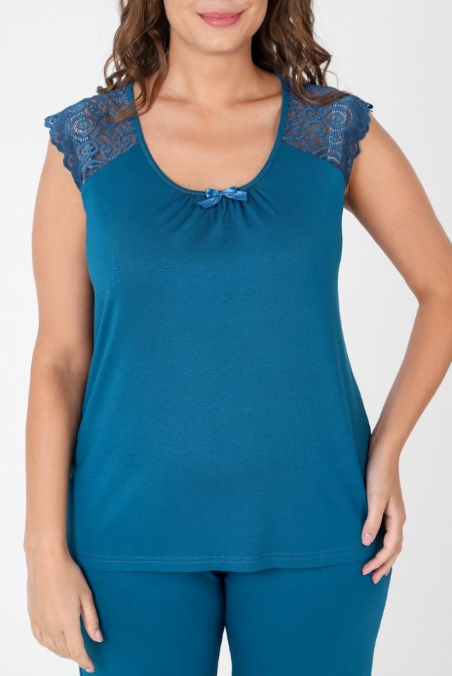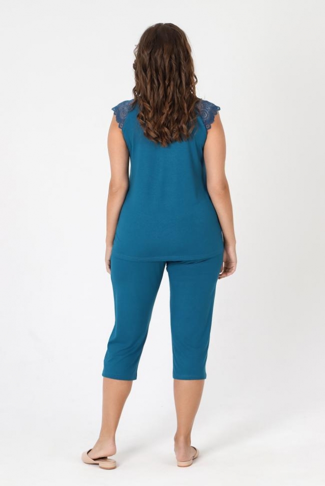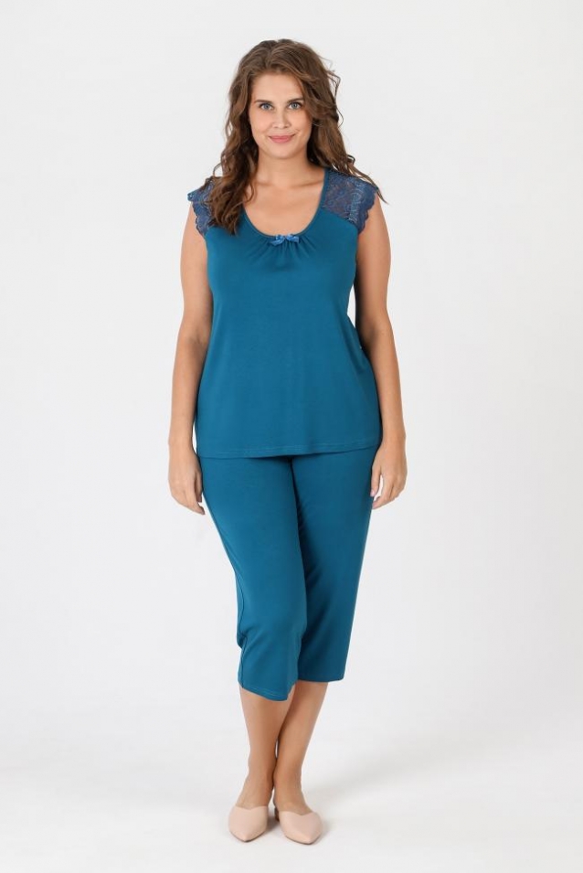 Пижама - женская из трикотажного гладкокрашенного вискозного полотна, состоящая из футболки и бридж. Футболка - слегка расширенная книзу, с короткими кружевными рукавами покроя «реглан» и горловиной овальной формы, окантованной основным материалом. По срезу горловины выполнена небольшая сборка, по центру декоративный бантик из узкой атласной ленты.Бриджи – свободного покроя, с эластичной тесьмой по талии. Комментарии к товару