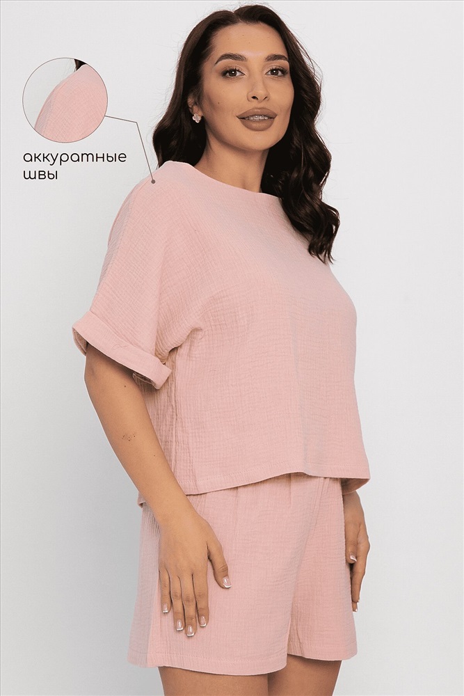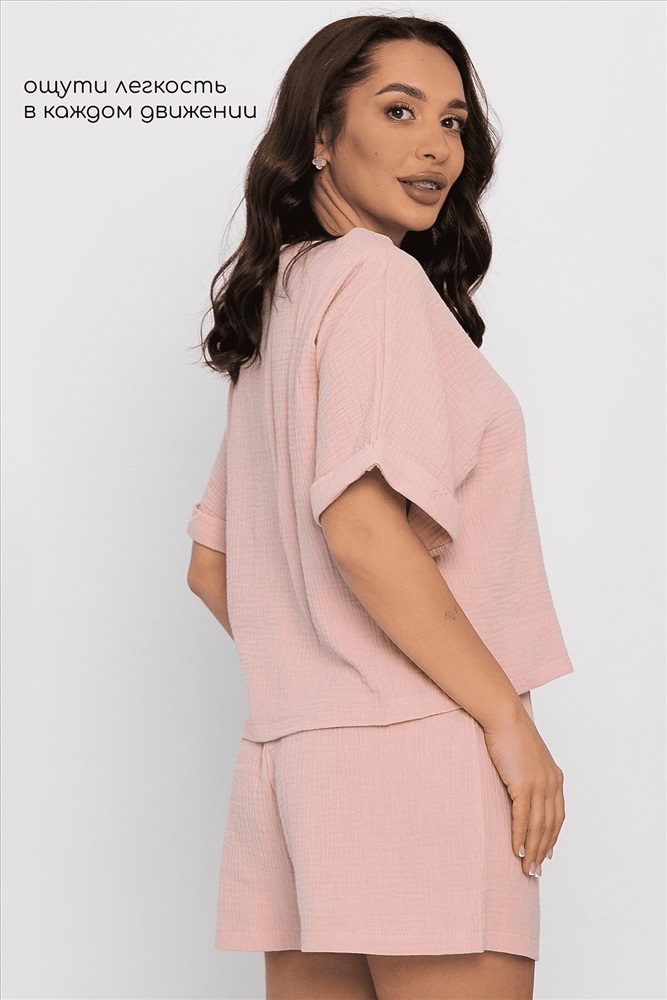 ID товара: 1206943 Состав: 100% Хлопок Сезон: Демисезон Длина: Средняя Фасон: Свободный Рукав: короткие Основная ткань: Хлопок Страна бренда: Россия Страна производства: Россия Состав : 100% хлопок Материал : муслин Цвет : розовый Принт : отсутствует Силуэт : свободный Карманы : отсутствуют Резинка в поясе : да Вид застежки : без застёжки Декоративные элементы : отсутствуют Отснято с халатом-кимоно П14578-52М Комплект для дома и отдыха из муслина — это гармоничное сочетание стиля и удобства. Он создан для того, чтобы подарить вам незабываемые моменты расслабления и наслаждения. В комплект входят футболка и шорты, которые идеально сочетаются друг с другом. Футболка укороченного кроя с цельнокроеными рукавами, обработанными манжетами, и свободным силуэтом обеспечивает максимальный комфорт. Шорты свободного кроя с цельнокроеным поясом и тонкой мягкой резинкой по талии. Муслин — это натуральная ткань из хлопка, которая идеально подходит для домашнего отдыха. В ней вы будете чувствовать себя комфортно и уютно. Позвольте себе насладиться отдыхом с нашим новым комплектом из муслина и получите максимум удовольствия и стиля! Внимание! Рекомендуем ориентироваться на размерную сетку и выбирать свой привычный размер, согласно размерной таблице. *Допуск отклонения длины при массовом производстве 1-3 см является нормой. Уход за изделием: Ручная стирка или стирка в машине при температуре до 30 °C, деликатный режим. Не использовать отбеливатели. Разрешена глажка при температуре до 110 °C. При глажке использовать специальную насадку на подошве утюга, гладить с паром. Не замачивать и не выжимать. Стирать изделие наизнанку, отдельно от других вещей. Комментарии к товару