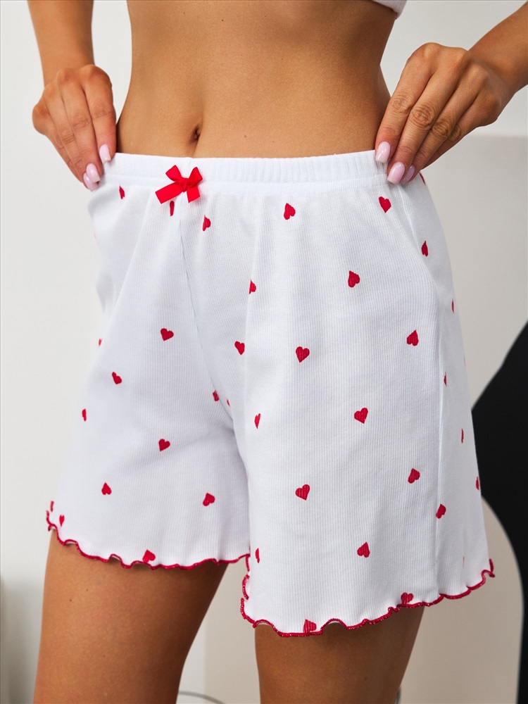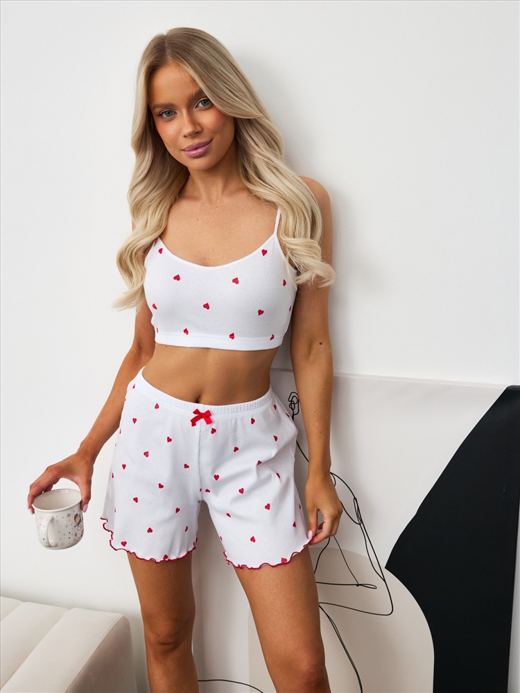 Пижама молодежная из трикотажного полотна «кашкорсе» с набивным рисунком состоящая из майки-топа и шорт. Майка-топ – на узких бретелях, с V-образным вырезом горловины, низ изделия с эластичной тесьмой, которая дает прилегание по фигуре.Шорты - укороченные, расширенные книзу, с эластичной тесьмой по талии и атласным бантиком в центре. Нижние срезы шорт обработаны узкой обметочной строчкой контрастного цвета, создающей красивый волнистый край.
