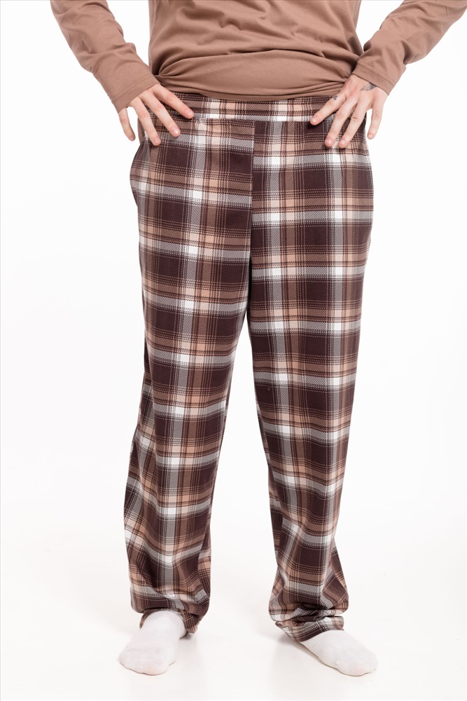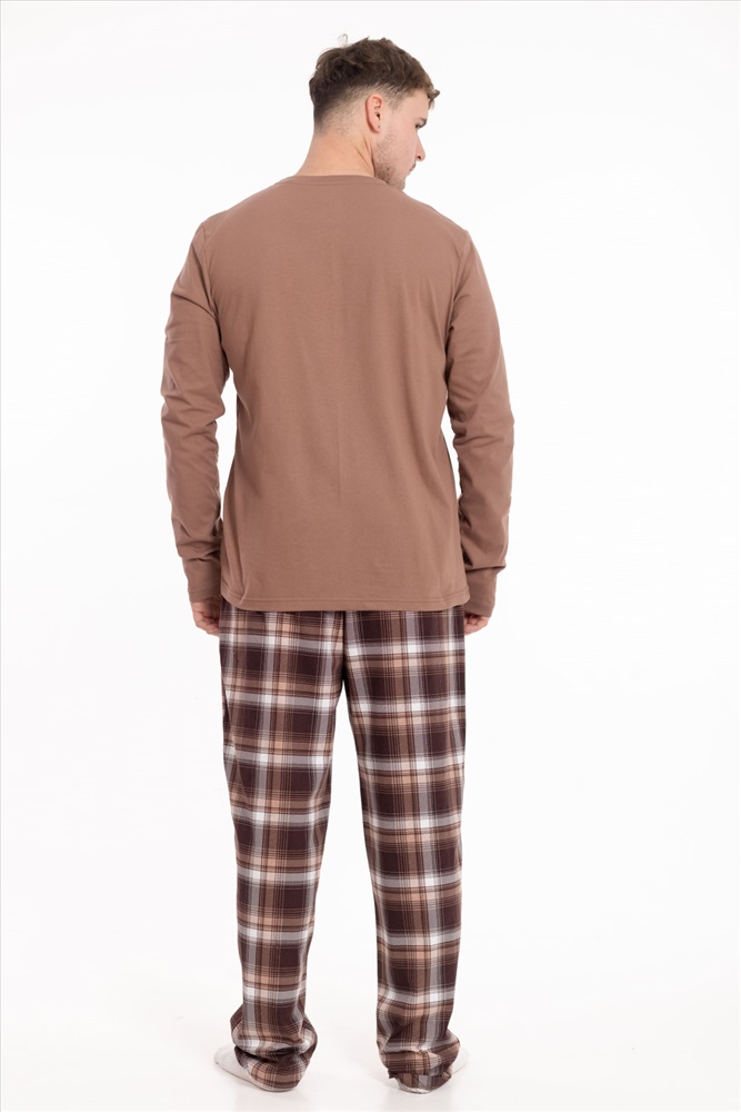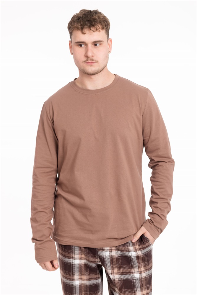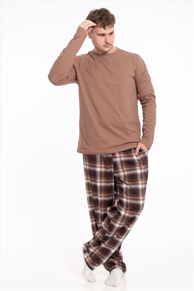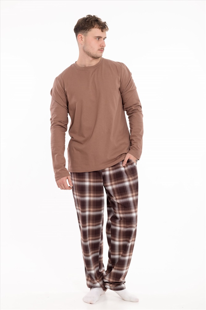 Вид низа комплекта: Брюки Вид ткани: Кулирка Сезон: Всесезонный Состав: Хлопок 100% Цвет Номенклатуры: коричневый/белый Мужская пижама из хлопкового полотна — комфортный и практичный вариант для сна и домашнего отдыха. Пижама состоит из лонгслива и брюк. Лонгслив с втачным рукавом обеспечивает удобную посадку и свободу движений, отлично подходит для повседневной носки дома. Брюки прямого силуэта, с поясом на мягкой резинке и удобными карманами в боковых швах — всё для максимального комфорта. Пижама выполнена из натурального хлопкового полотна, приятного к телу, хорошо пропускающего воздух и подходящего для ежедневной носки. Комментарии к товару
